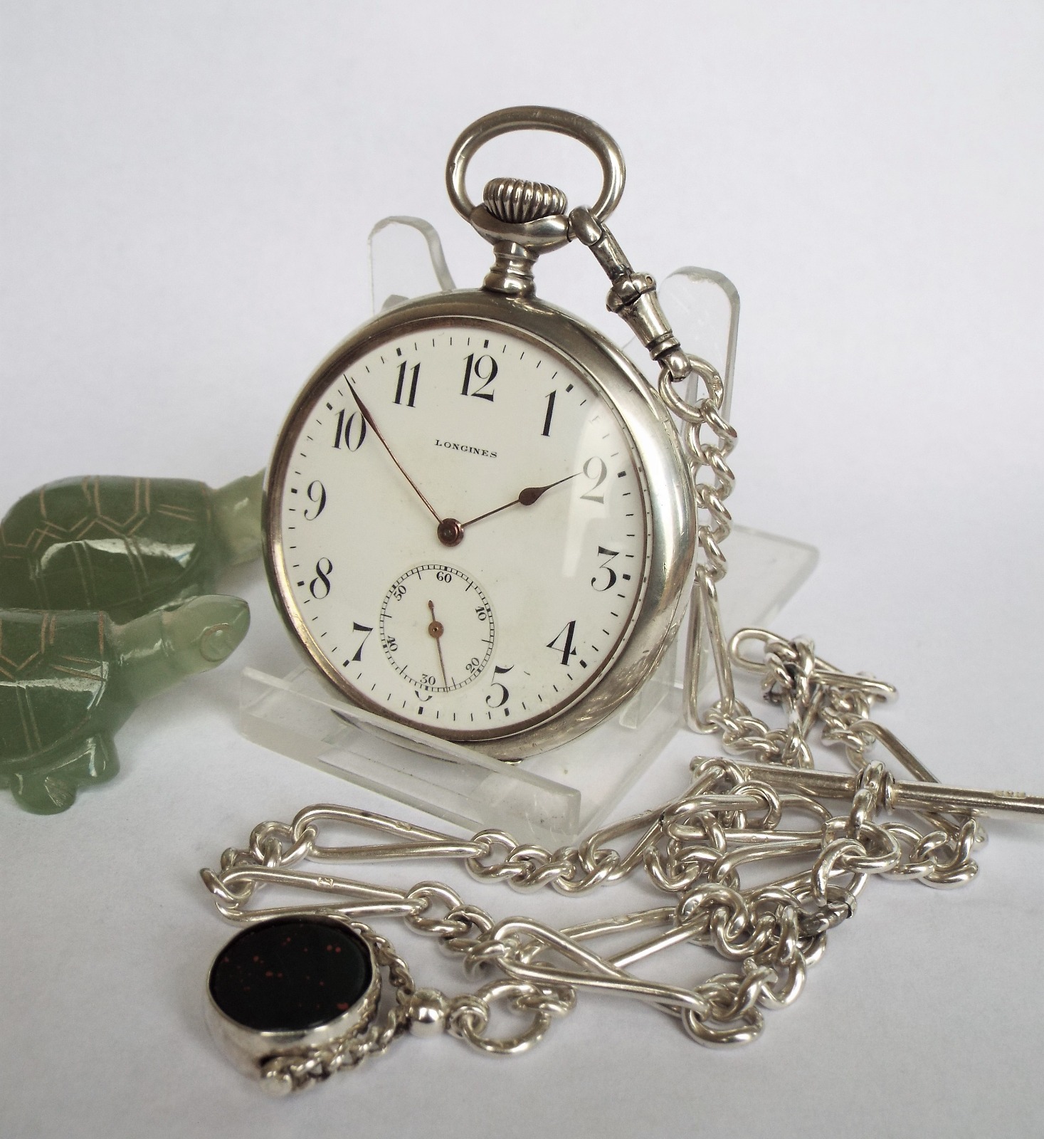 1923 Silver Longines Pocket Watch, Chain & Swivel
