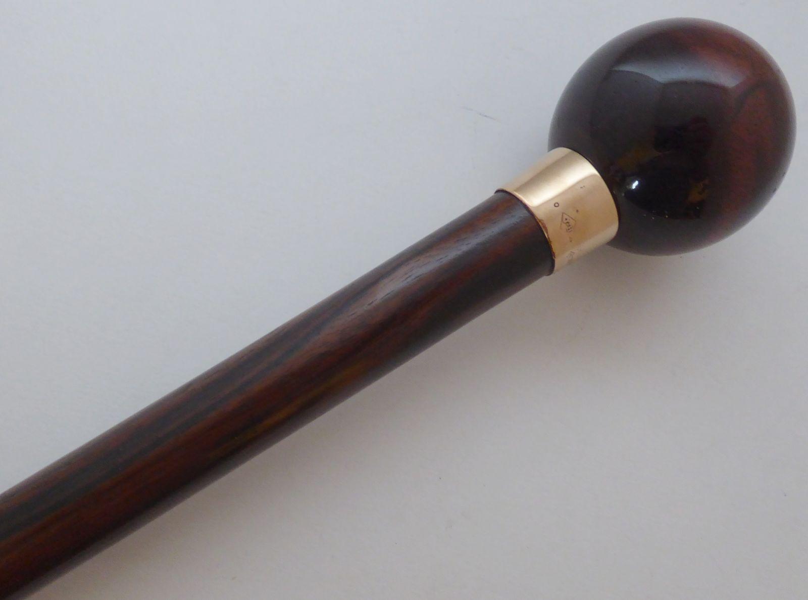 1923 Walking Stick Cane 9ct Rose Gold Collar Coromandel Shaft Tigers Eye Pommel