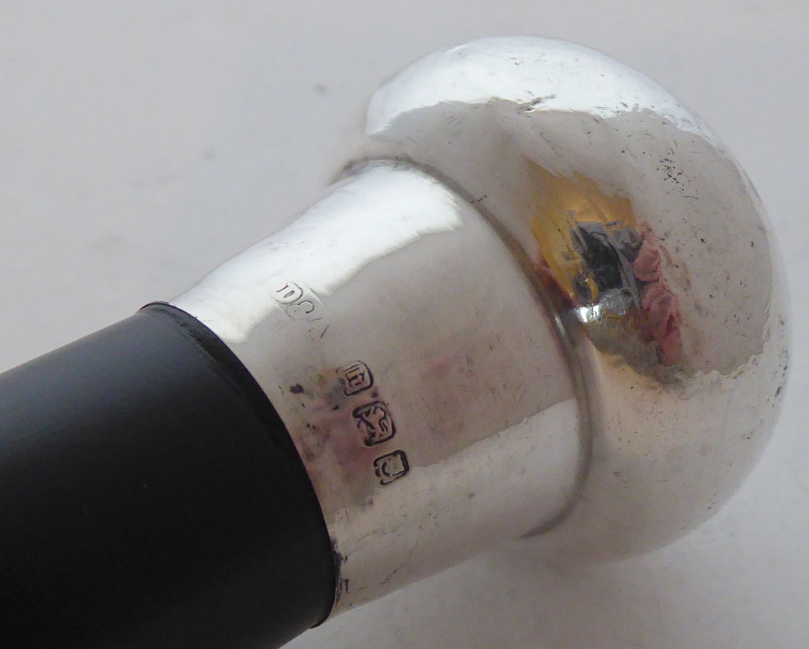 1923 Walking Stick Cane Hallmarked Solid Silver Pommel Ebonised Wood Shaft
