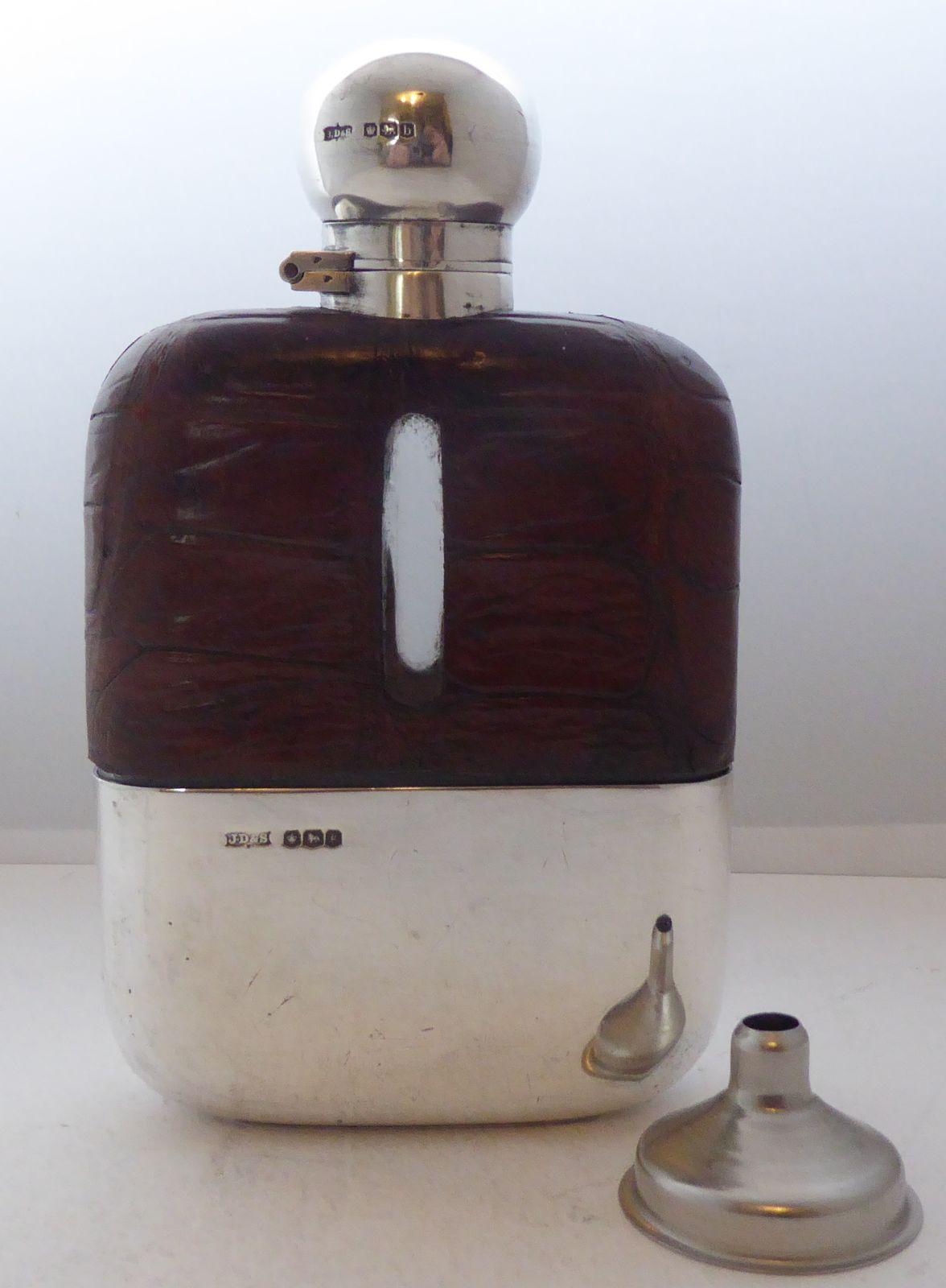 1924 Hallmarked Solid Silver Crocodile Skin Bound Glass Hip Flask James Dixon