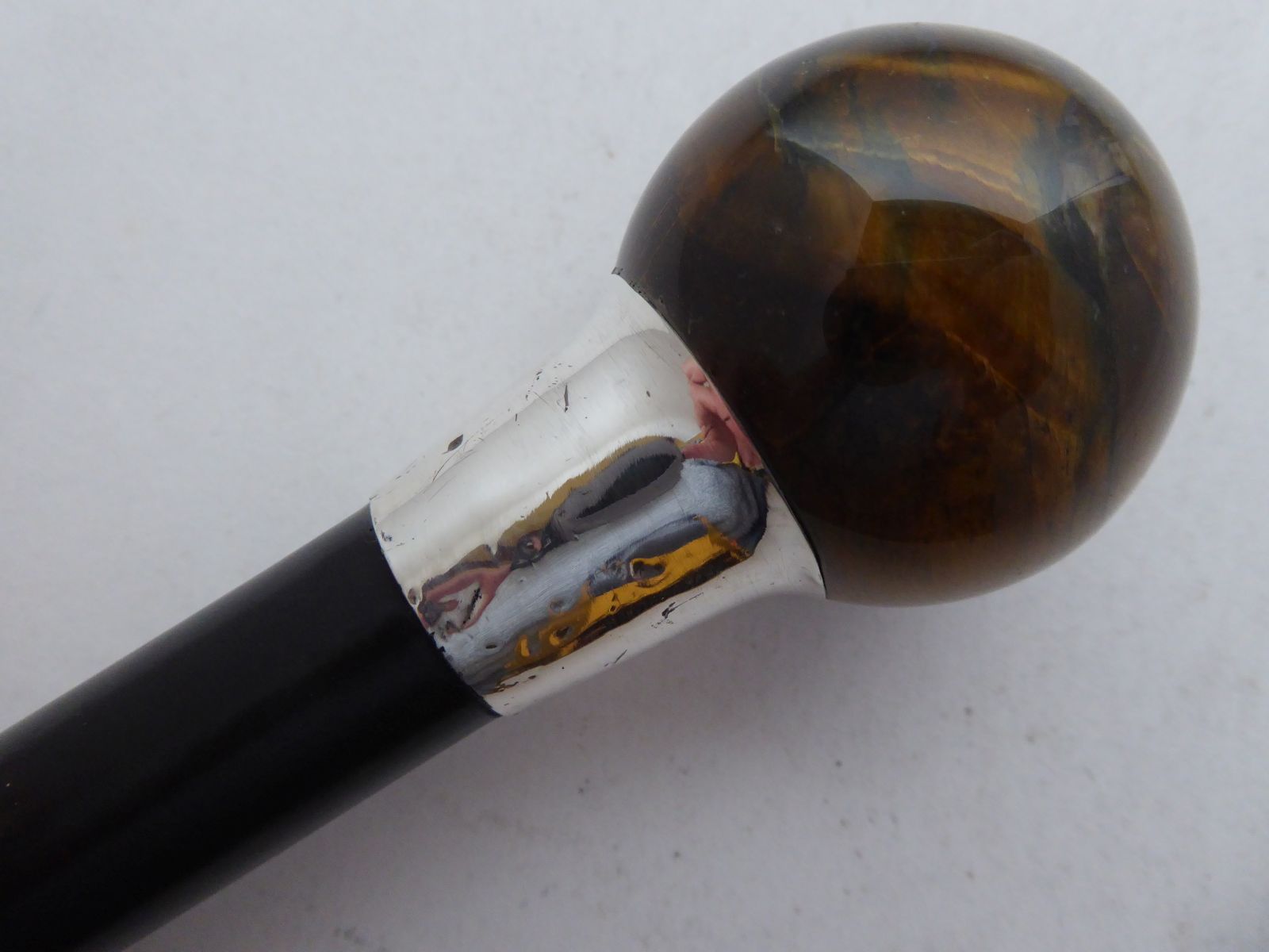 1924 Walking Stick Cane Solid Silver Collar Tigers Eye Pommel Ebonised Shaft