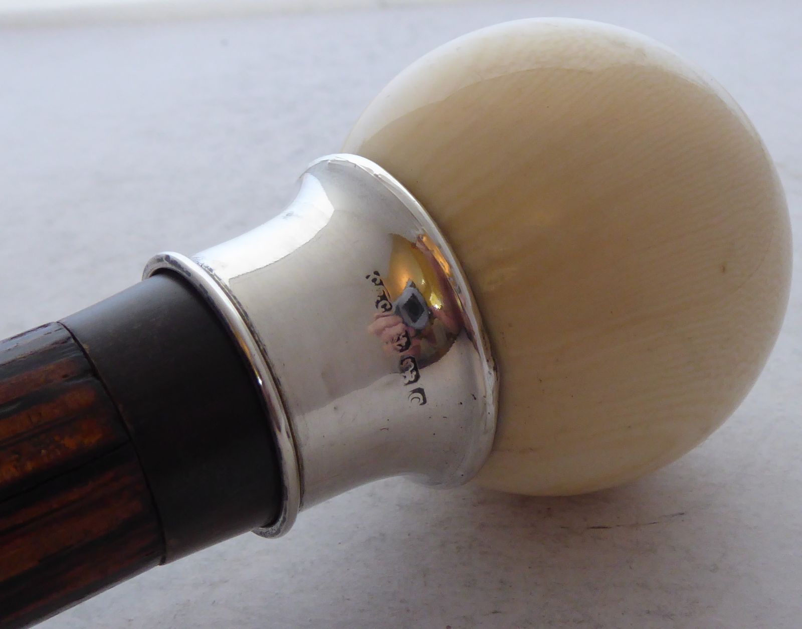 1927 Silver Collar Walking Stick Cane Palm Wood Shaft Ball Top