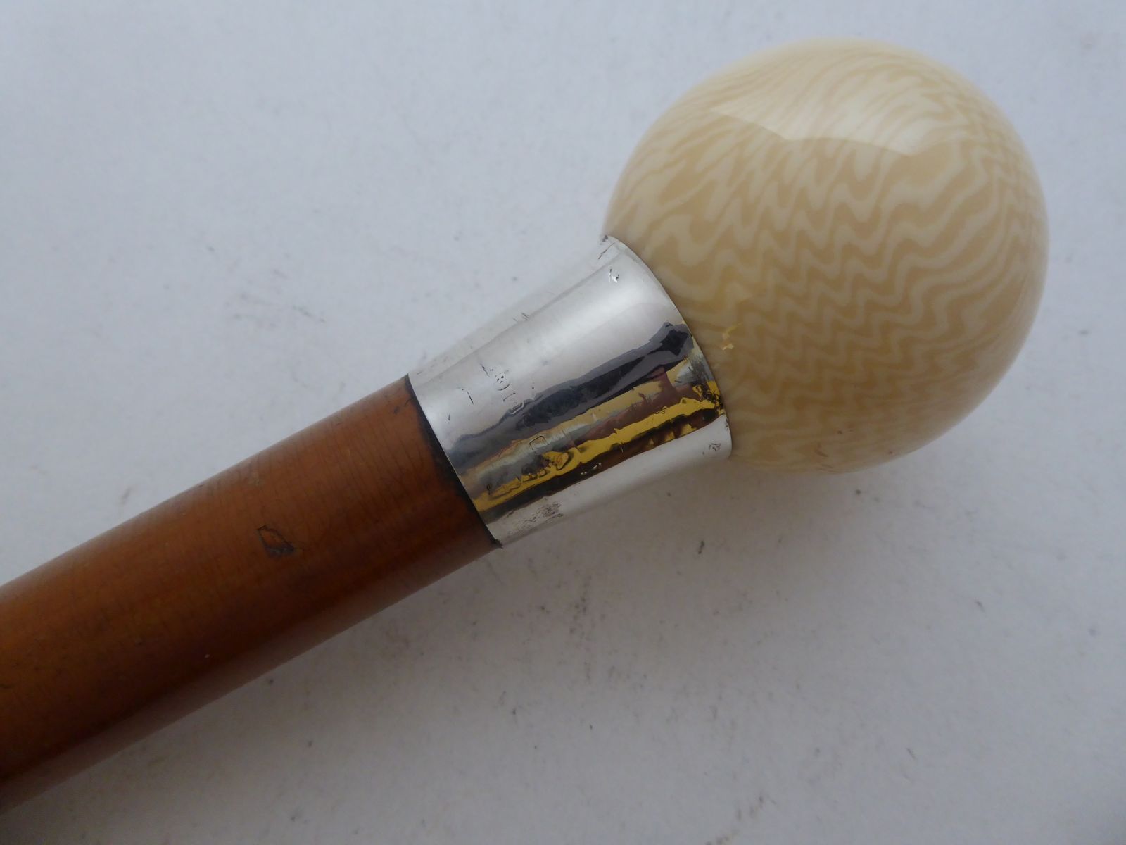 1927 Walking Stick Cane Hallmarked Solid Silver Collar Malacca Shaft Tagu Nut Pommel
