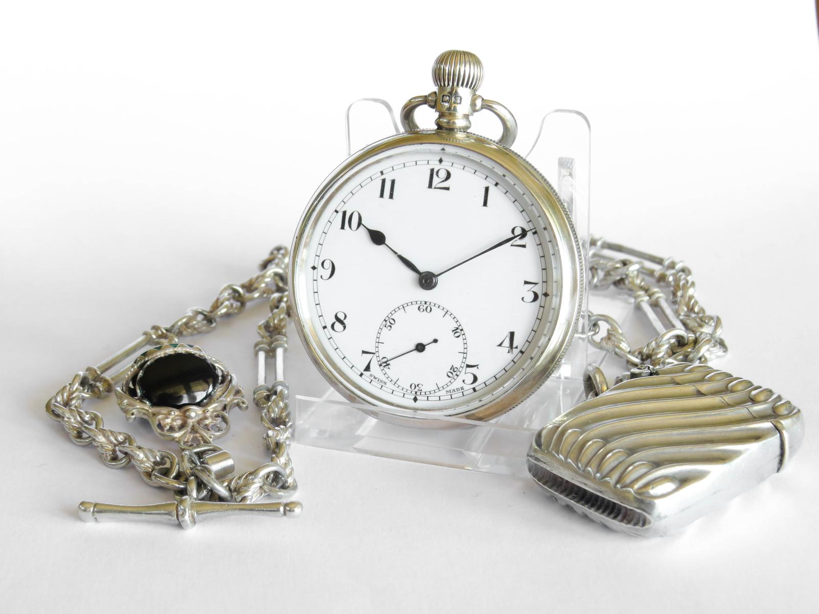 1929 Silver Pocket Watch with Chain & Vesta Case