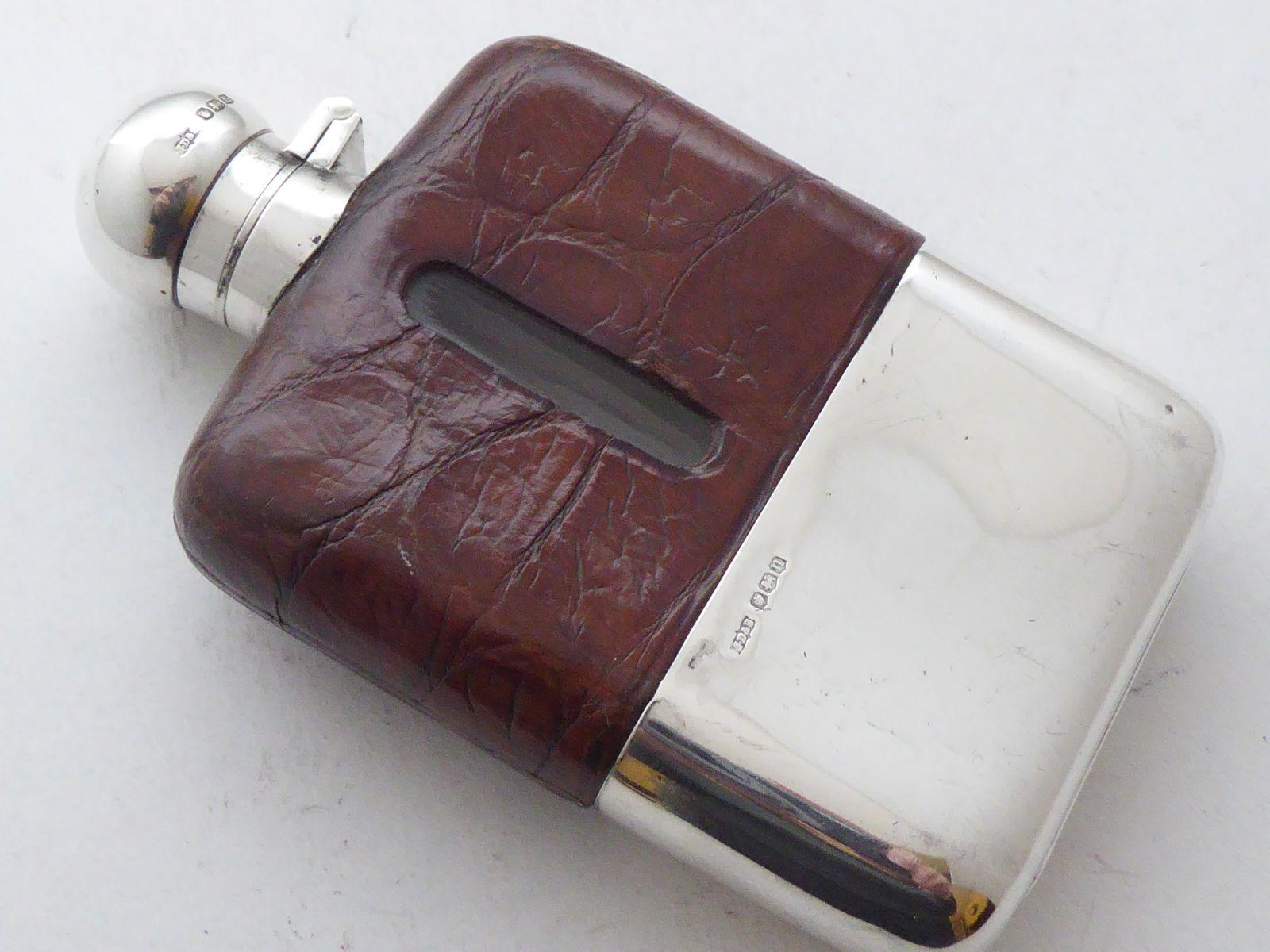 1930 Hallmarked Solid Silver Crocodile Skin Bound Glass Hip Flask James Dixon