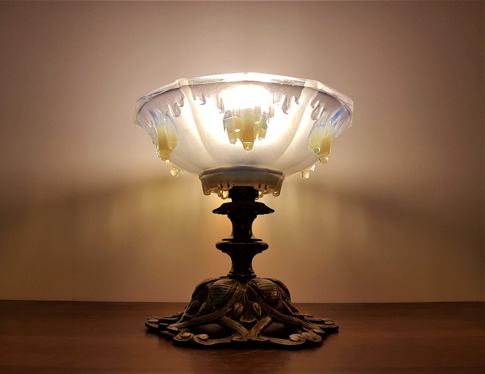 1930s French Ezan Opalescent Glass in Art Deco Icicles Design Lamp Shade & Brass Base