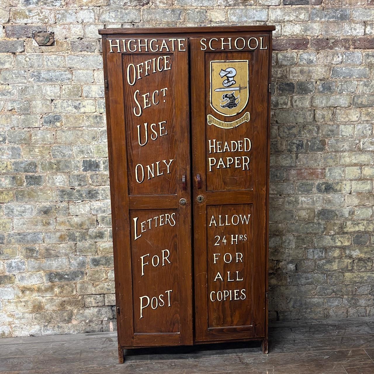 Constructed in stained oak with a pine-lined interior, the cupboard has hand-painted signage to the doors reading “Highgate School & Office Sect. Use Only”, along with additional instructions relating to internal use.
