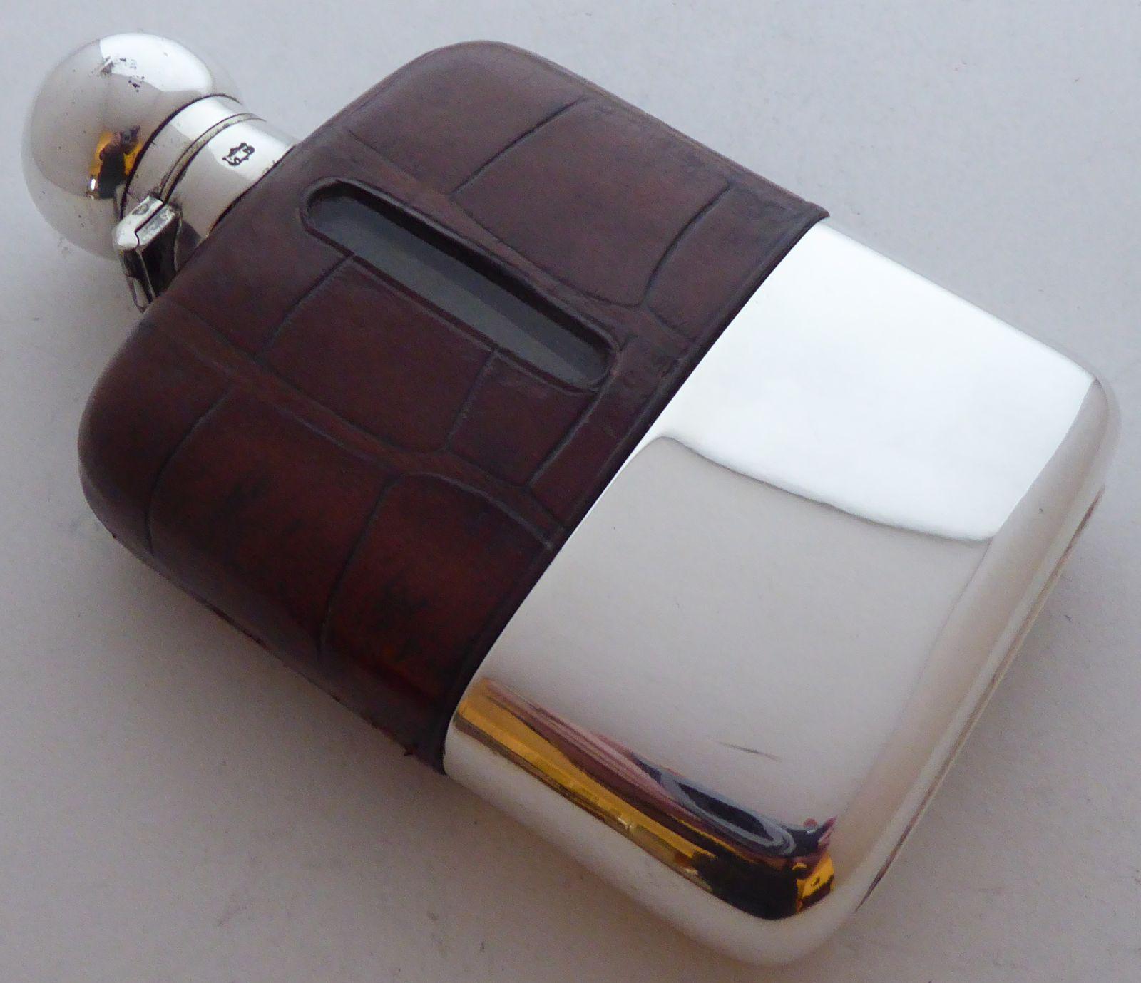 1930's James Dixon Silver Plated Crocodile Skin Bound Glass Hip Flask #2144