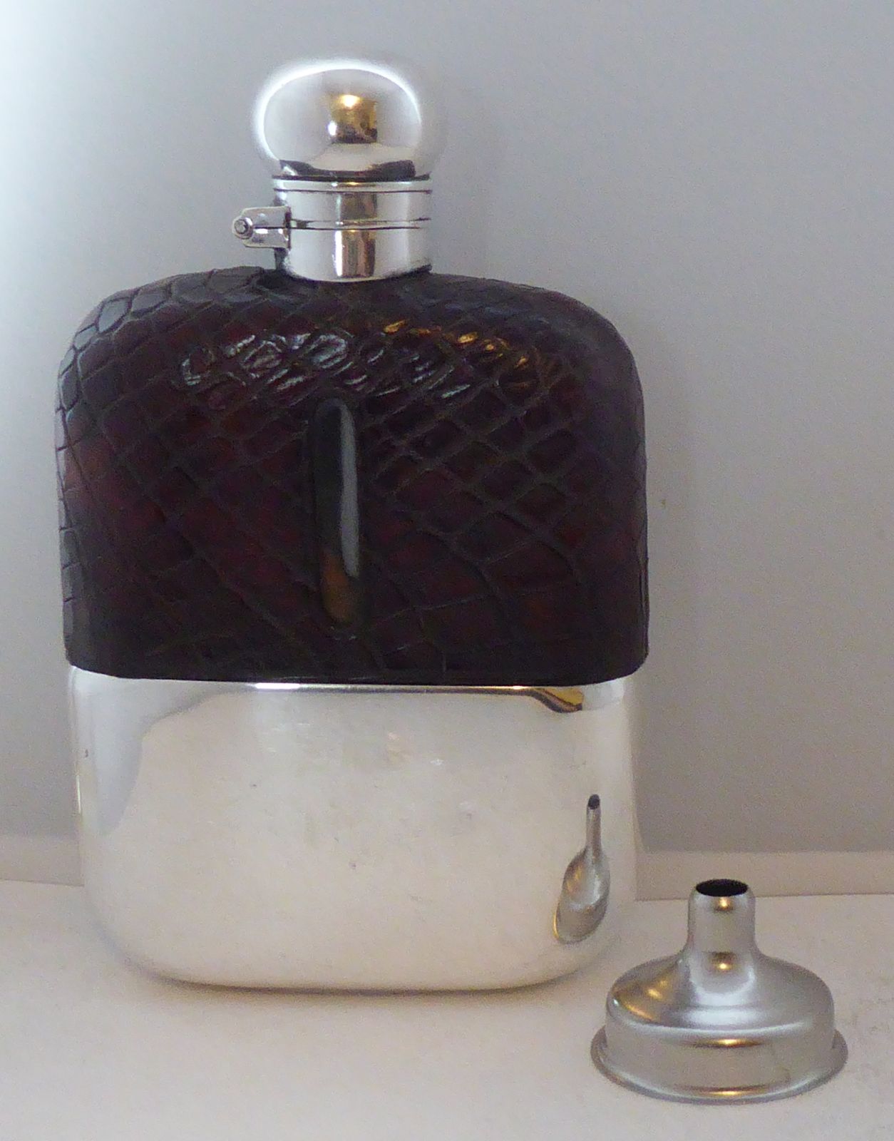 1930s Mappin & Webb Silver Plated Crocodile Skin Bound Glass Hip Flask