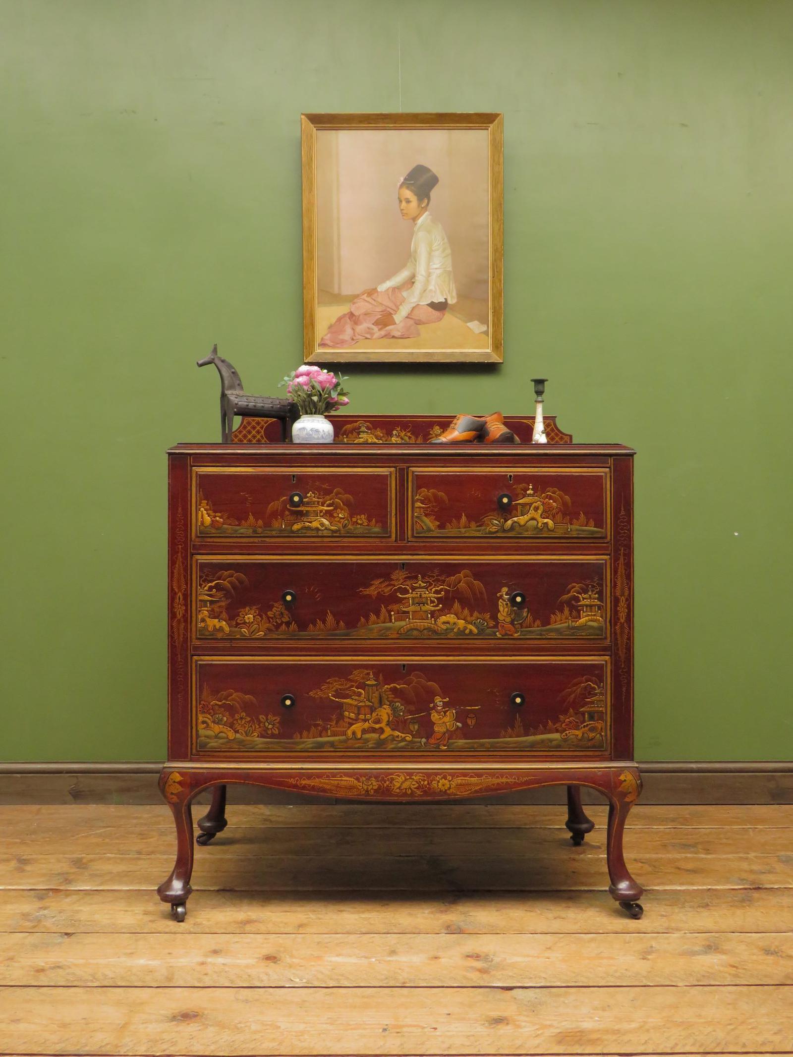 1930s Red Chinoiserie Chest of Drawers with Ornate Decoration & Gilding