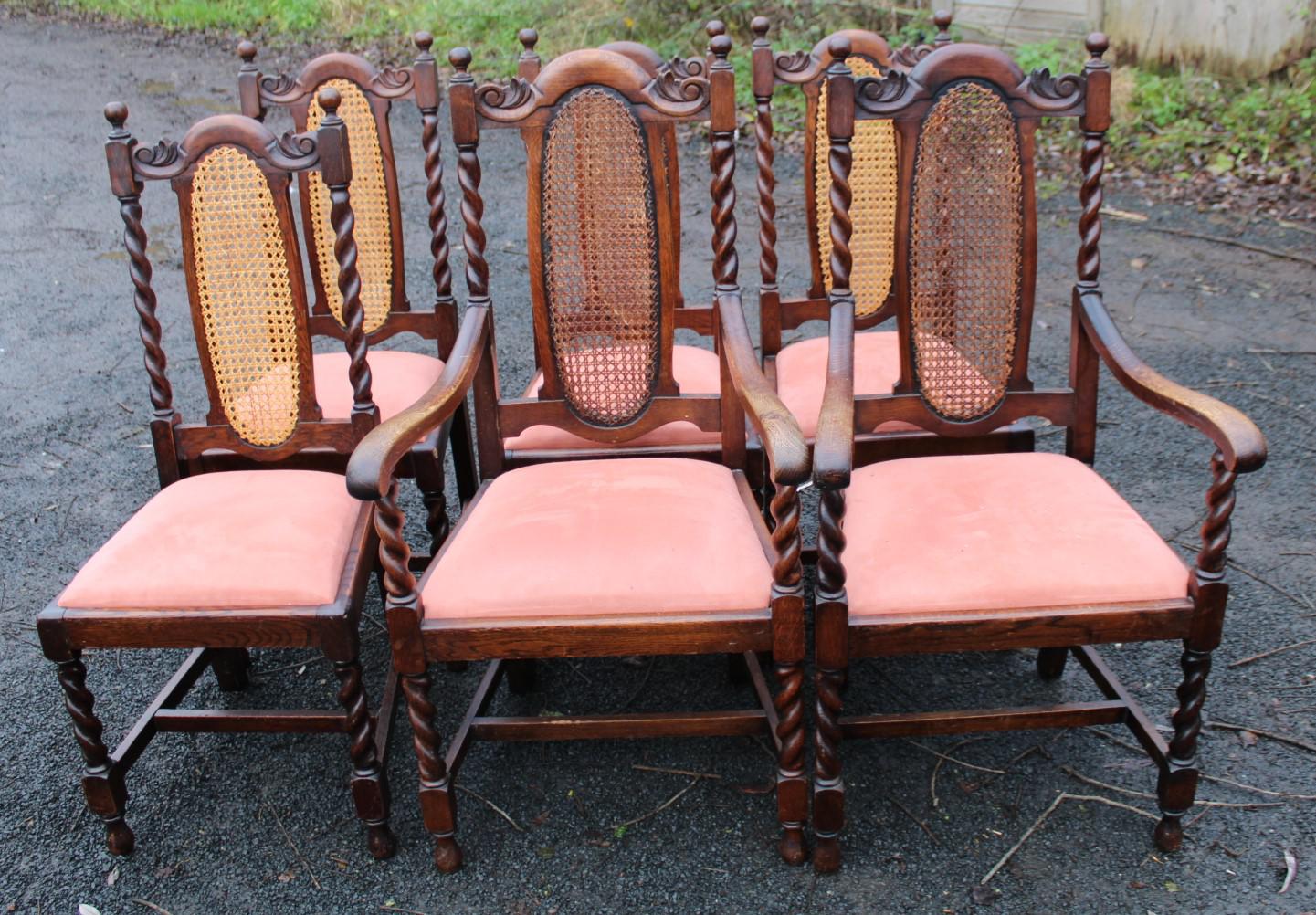 1930's Set of 6 Oak Barley Twist Dining Chairs with Cane Backs
