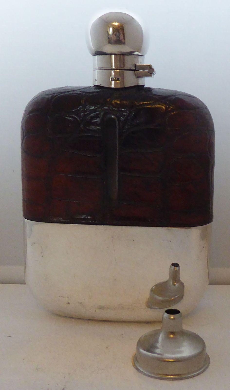 1930's Silver Plate Plated Crocodile Skin Bound Glass Hip Flask James Dixon