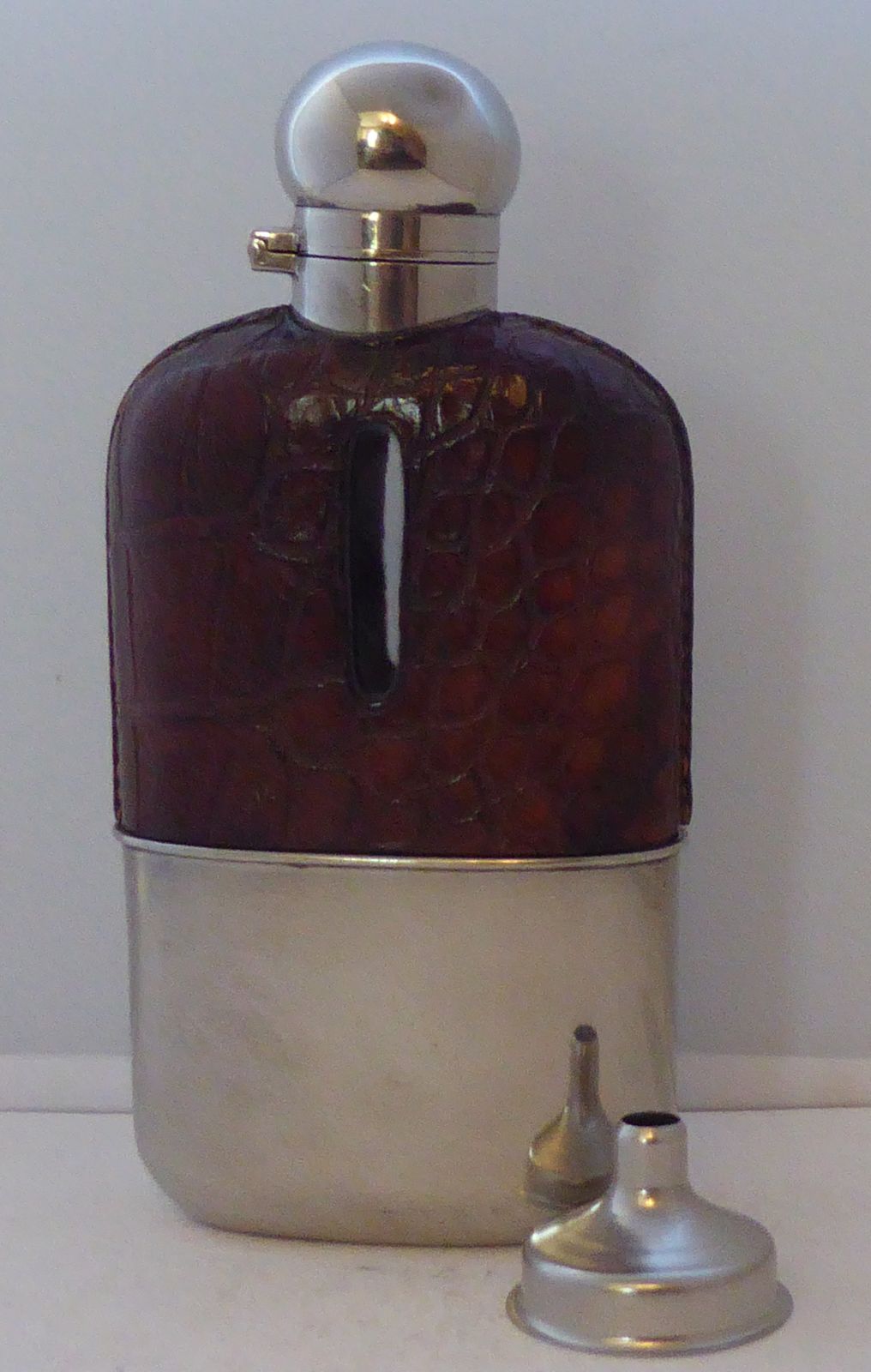 1930s Silver Plated Crocodile Skin Leather Bound Glass Hip Flask J Dixon