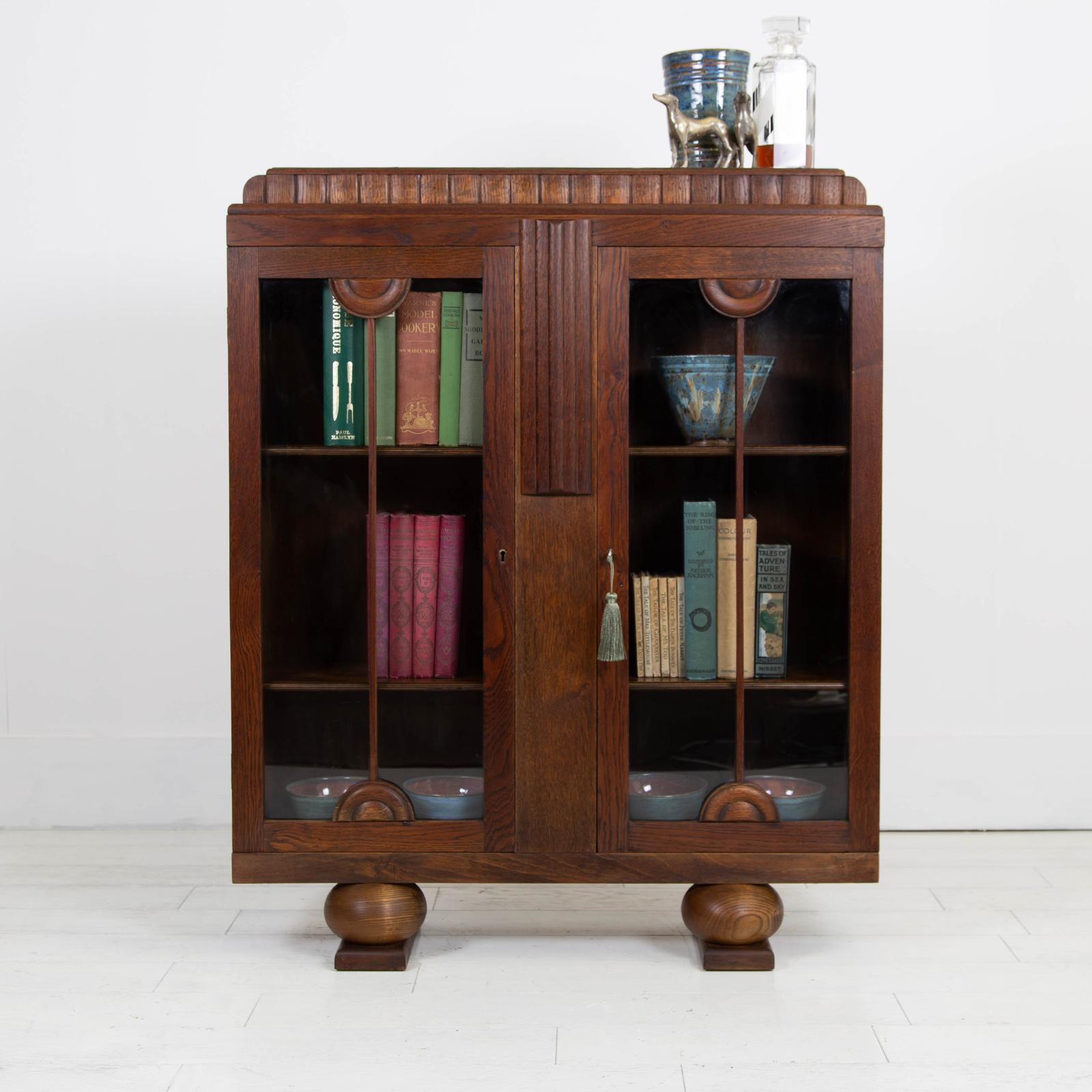 1930s Vintage Oak Glazed Cabinet Bookcase with Key