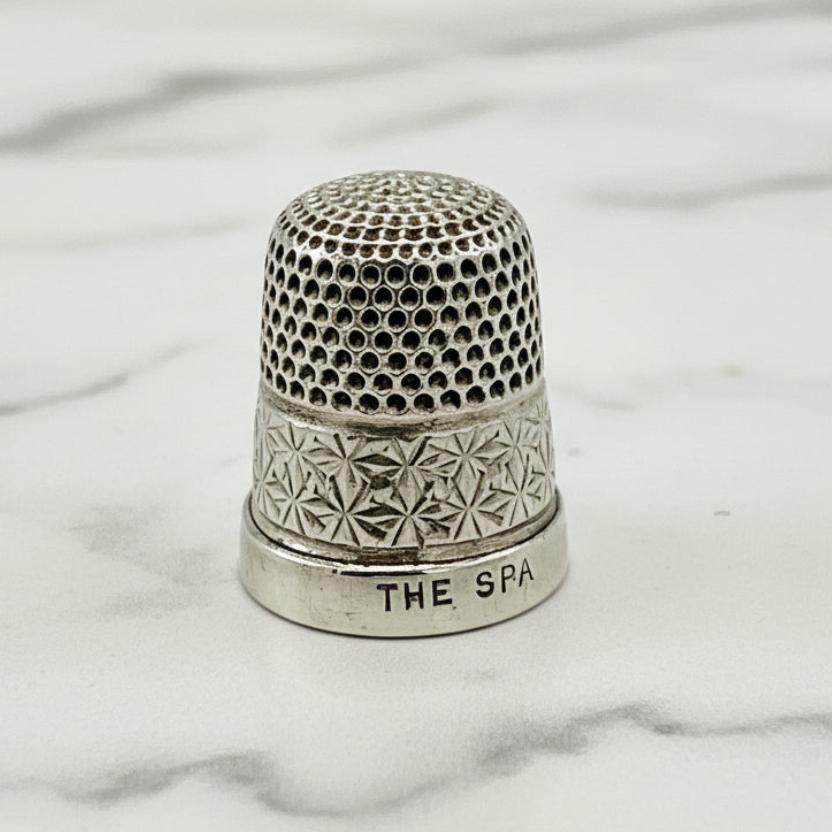 It’s a size 13 thimble. It was made by Henry Griffith and Sons and it was hallmarked in Birmingham in 1931. It has The Spa imprinted, referring to Henry Griffith and Sons move to Royal Leamington Spa in the late 1920s. The maker’s mark, hallmarks, and 13 for the size are on the rim.