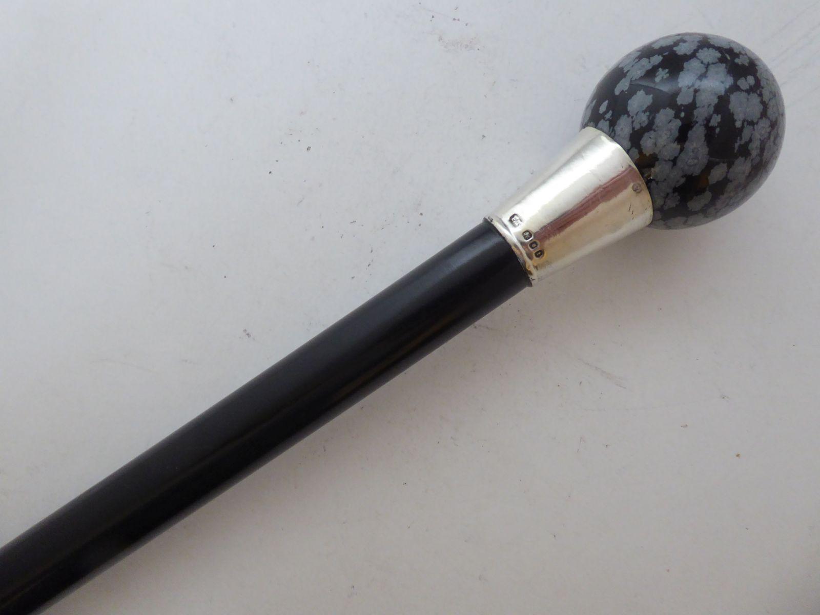 1934 Walking Stick Cane Hallmarked Silver Collar Ebony Wood Shaft Snowflake Obsidian Top
