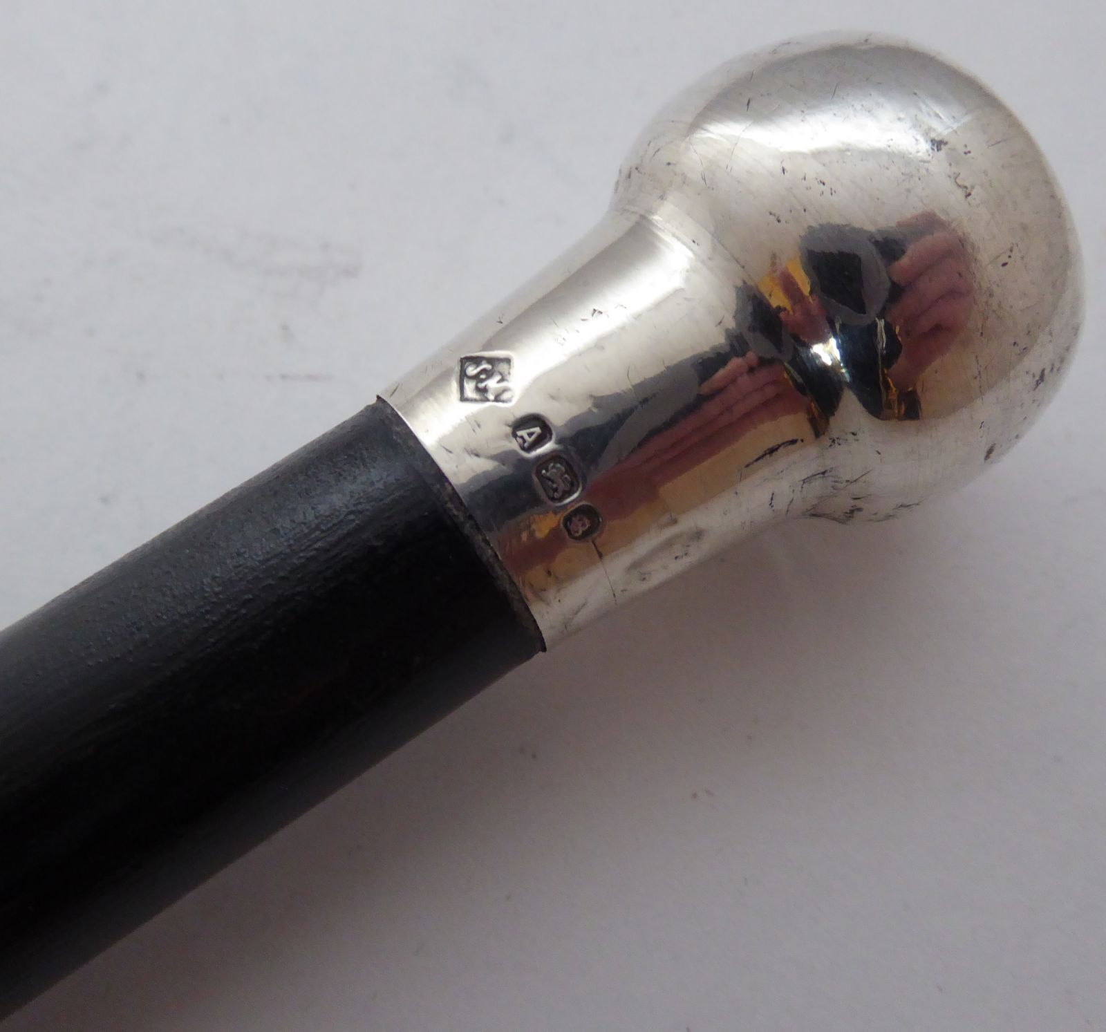 1936 Walking Stick Cane Hallmarked Solid Silver Pommel Ebonised Wood Shaft