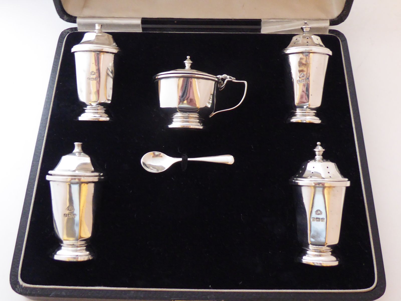 1937 Hallmarked Solid Silver 5 Piece Cruet Set Salt Pepper Mustard Shaker Pot