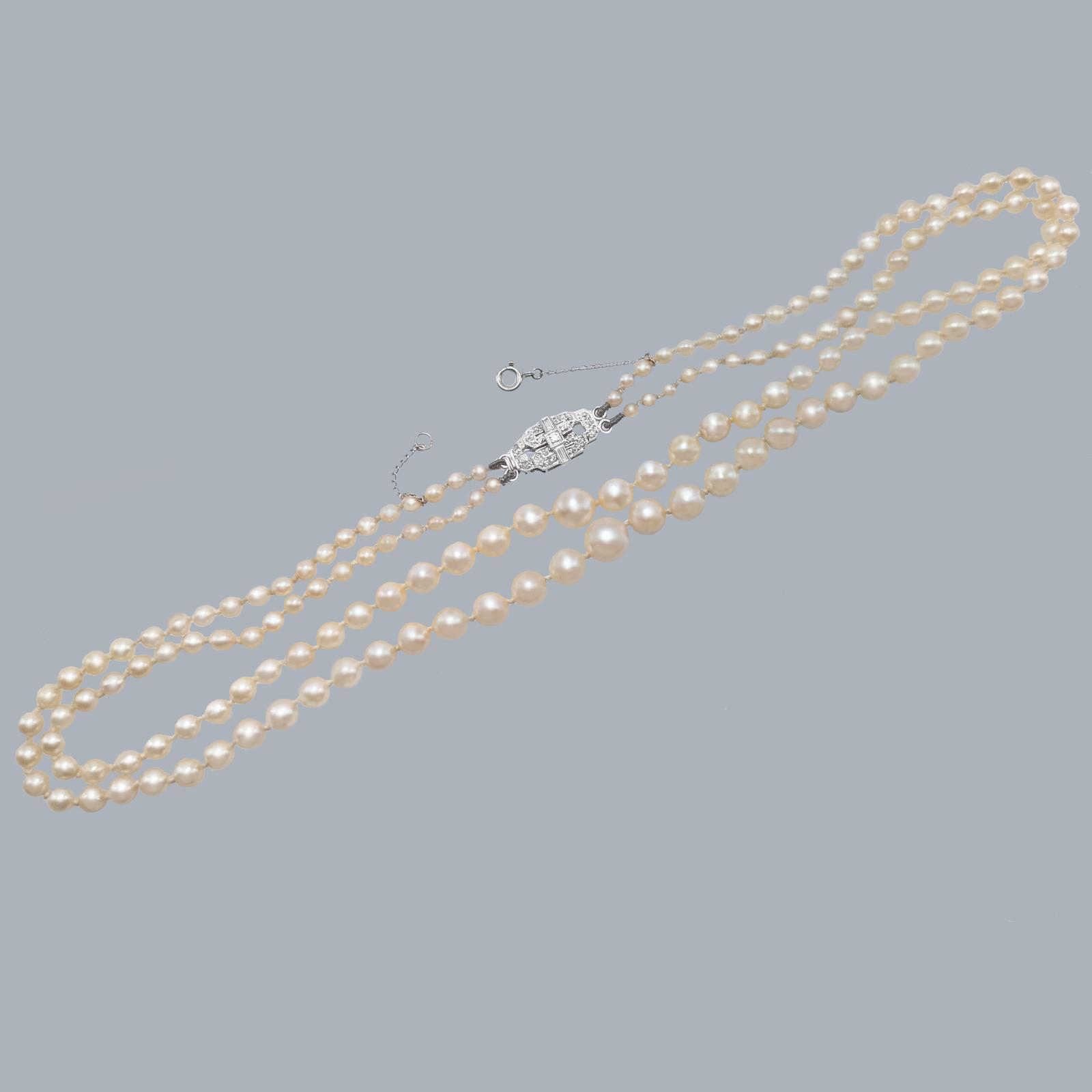 An elegant double strand pearl necklace dating to the 1940s, designed in the Art Deco style and finished with an exceptional diamond-set box clasp.
