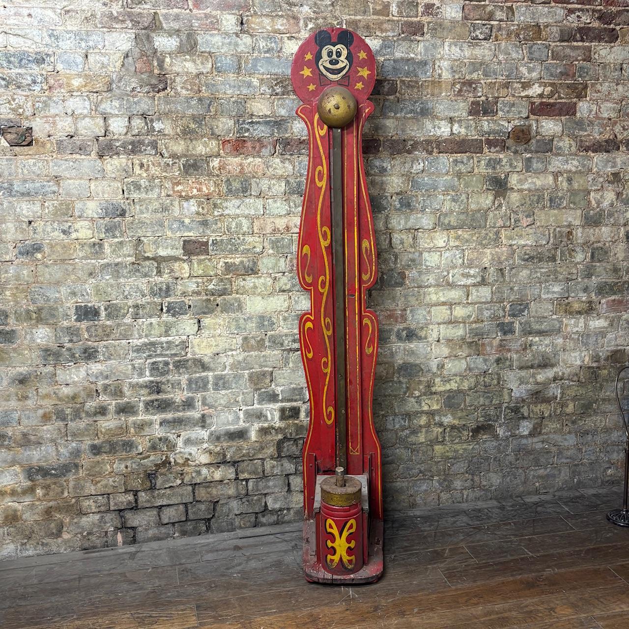 This tall, freestanding piece was originally used as a traditional test-your-strength game, where a weighted striker would be driven upward along the central track toward the bell at the top. The front is richly decorated in bold red and yellow with scrolling foliate motifs and a charming cartoon mouse figure to the crest, giving it strong period fairground presence and instant visual impact. The surface shows honest wear, paint loss, and knocks throughout, entirely consistent with decades of use in travelling fairs and amusement grounds.