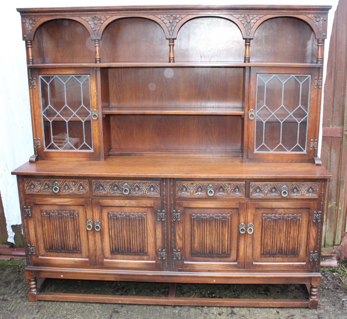 1940s Large Old Charm Oak Dresser with Leaded Glass Display Top