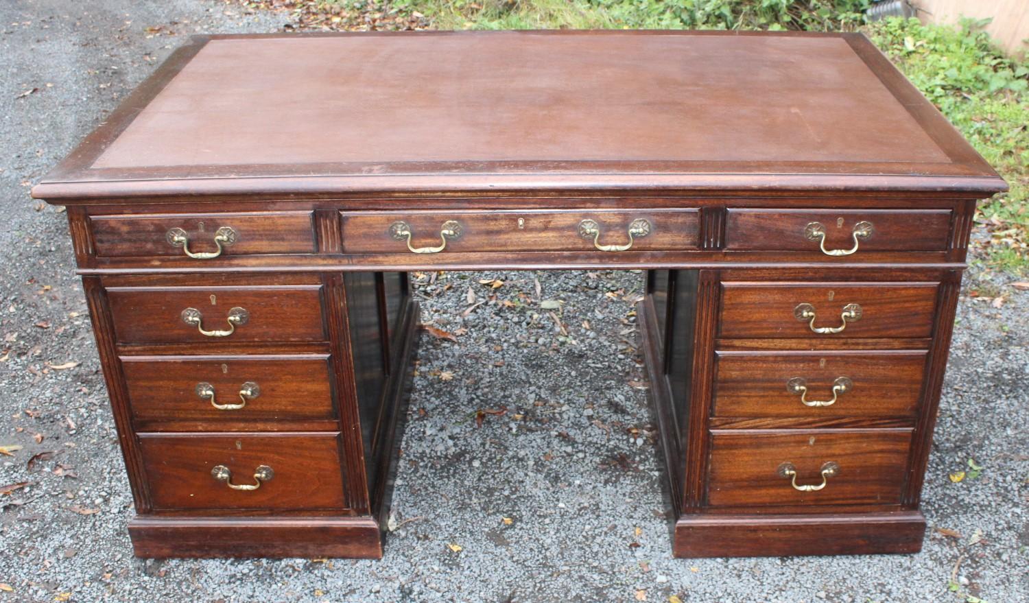 1940s Mahogany Pedestal Desk with Brown Leather Top