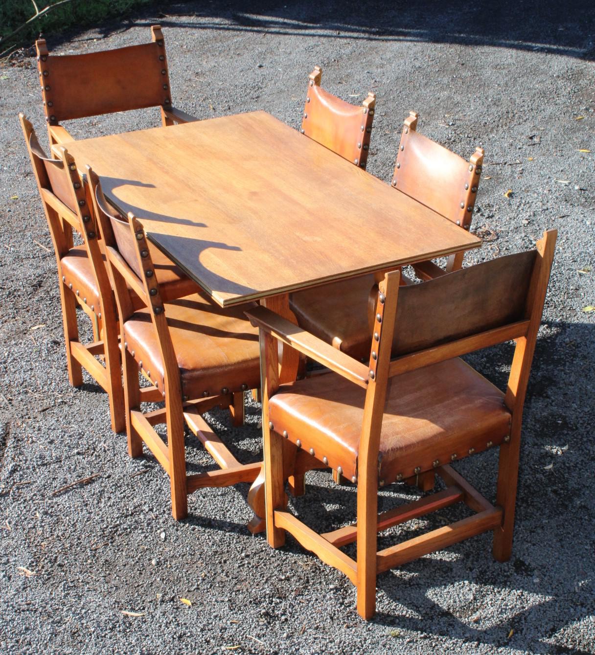 1940's Maple & Co Oak Dining Suite with Set 6 Oak Leather Dining Chairs