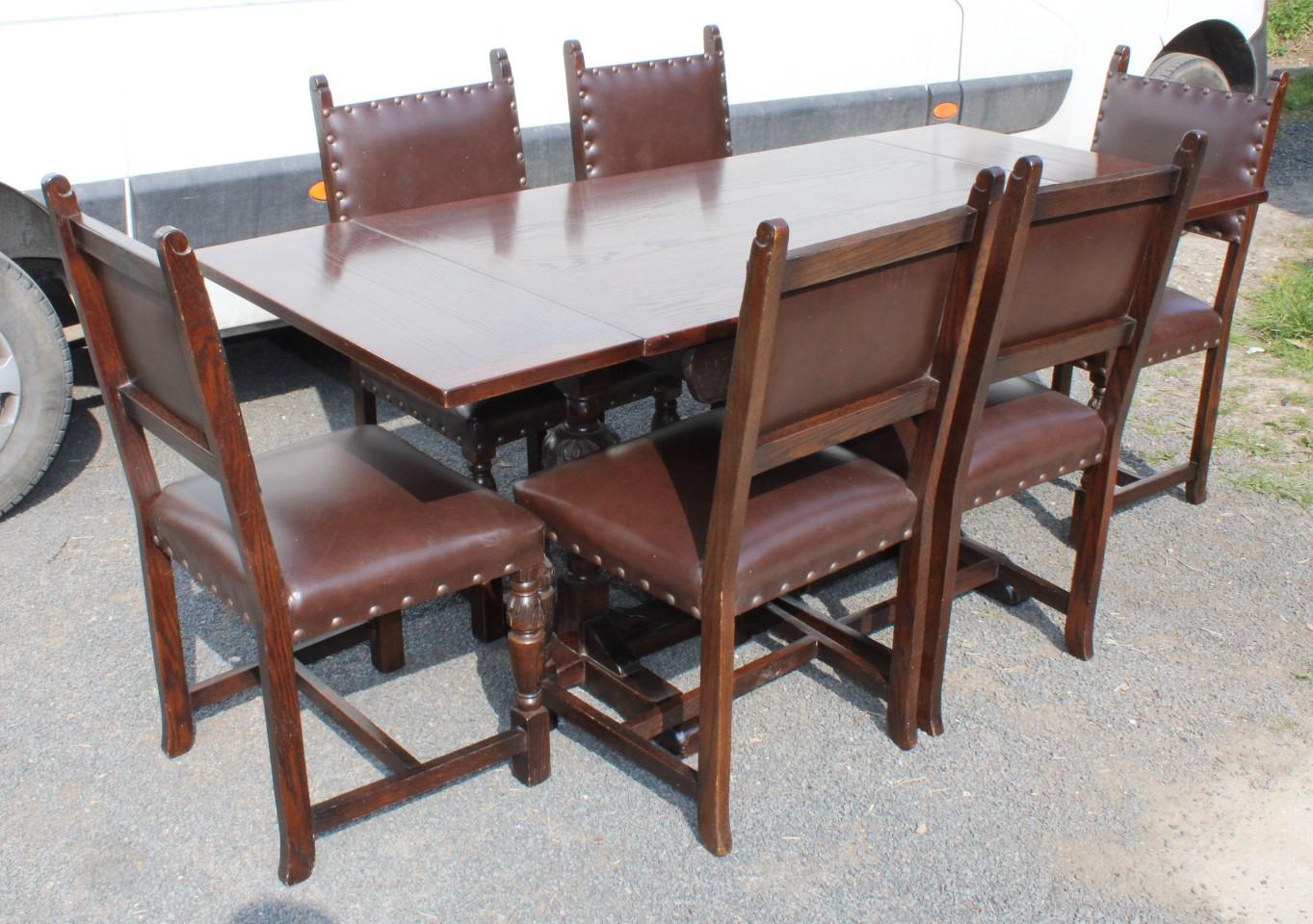 1940s Oak Drawleaf Table with Set 6 Oak Dining Chairs with Brown Leather Seats
