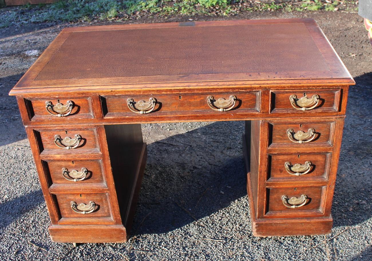 1940’s Oak Pedestal Desk with Brown Leather + Key