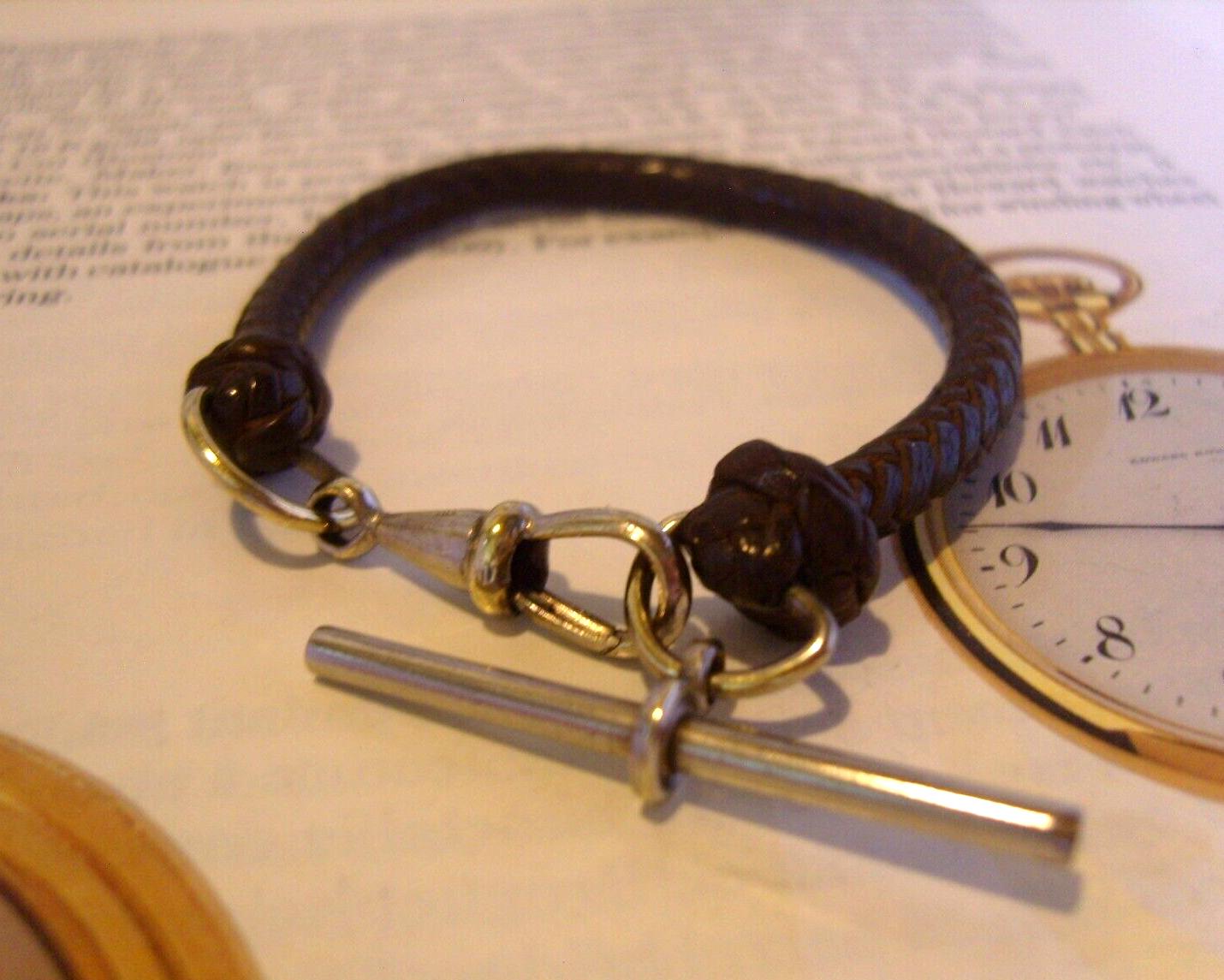 1940s Pocket Watch Albert Vintage Brown Leather With Large T Bar & Dog Clip