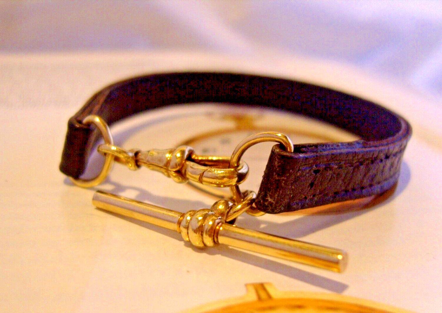 1940s Pocket Watch Chain Albert Black Leather Brass T Bar & Dog Clip