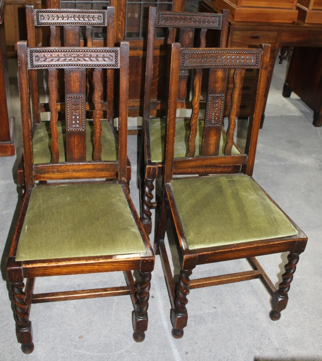 1940s Set 4 Oak Barley Twist Dining Chairs with Green Seats