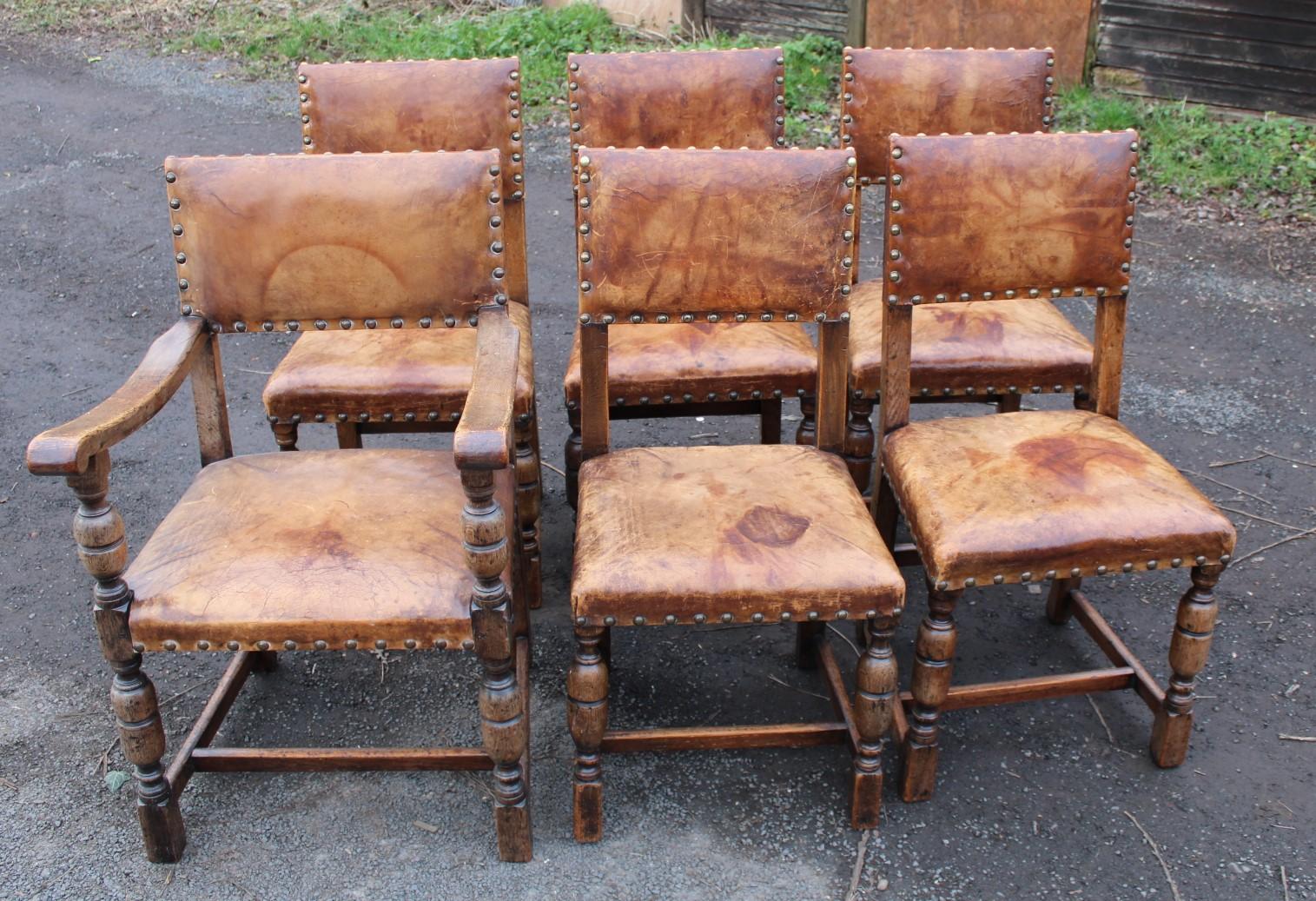 1940s Set 6 Oak Cromwellian Style Chairs with Brown Leather Seats