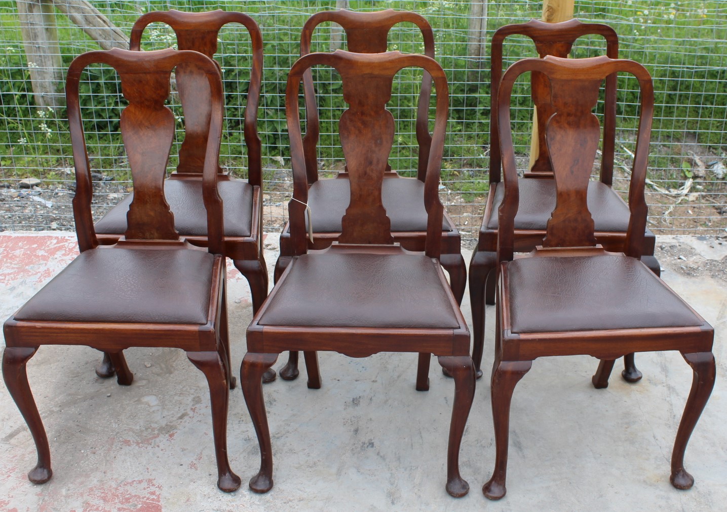 1940s Set 6 Walnut Queen Ann Style Dining Chairs with Pop Out Seats