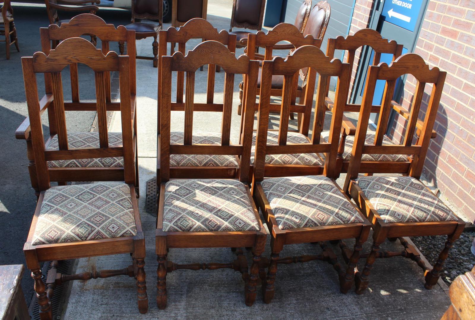 1940's Set 8 Highback Golden Oak Chairs with Pop out Seats.