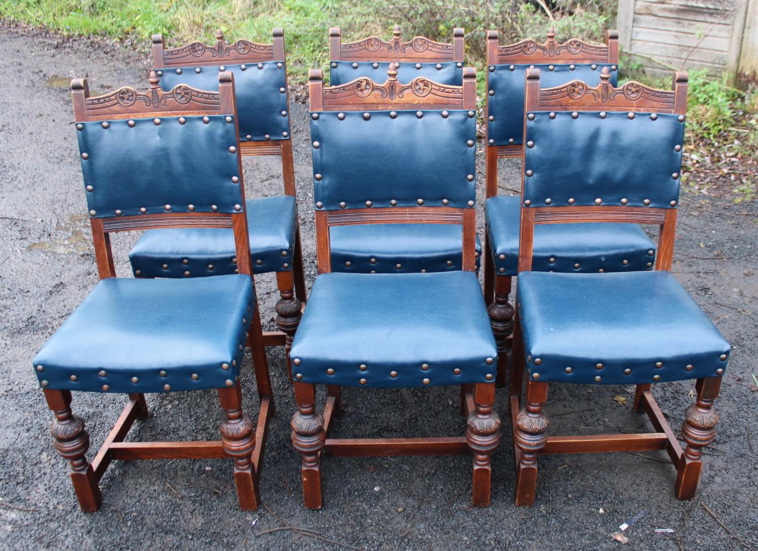 1940s Set of 6 Mahogany Blue Leather Dining Chairs with Pop Out Seats