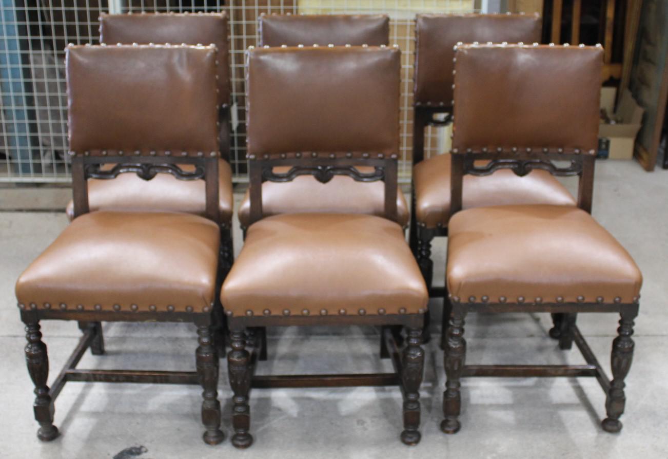 1940s Set of 6 Oak Dining Chairs with Brown Leather Seats