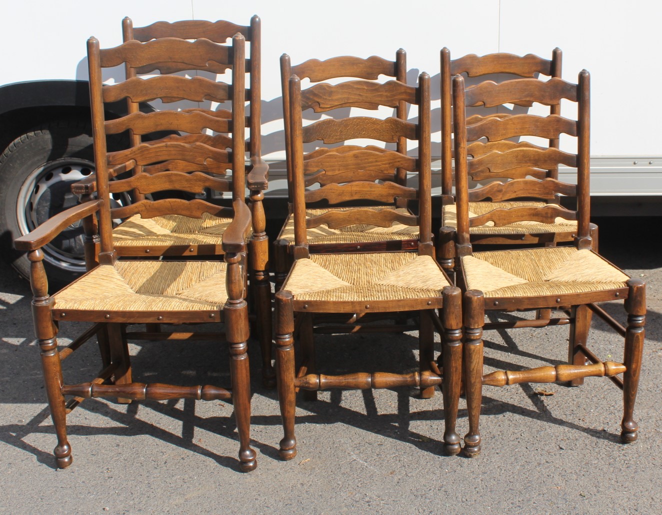 1940s Set of 6 Oak Ladderback Dining Chairs with Rush Seats. 4+2 Carvers