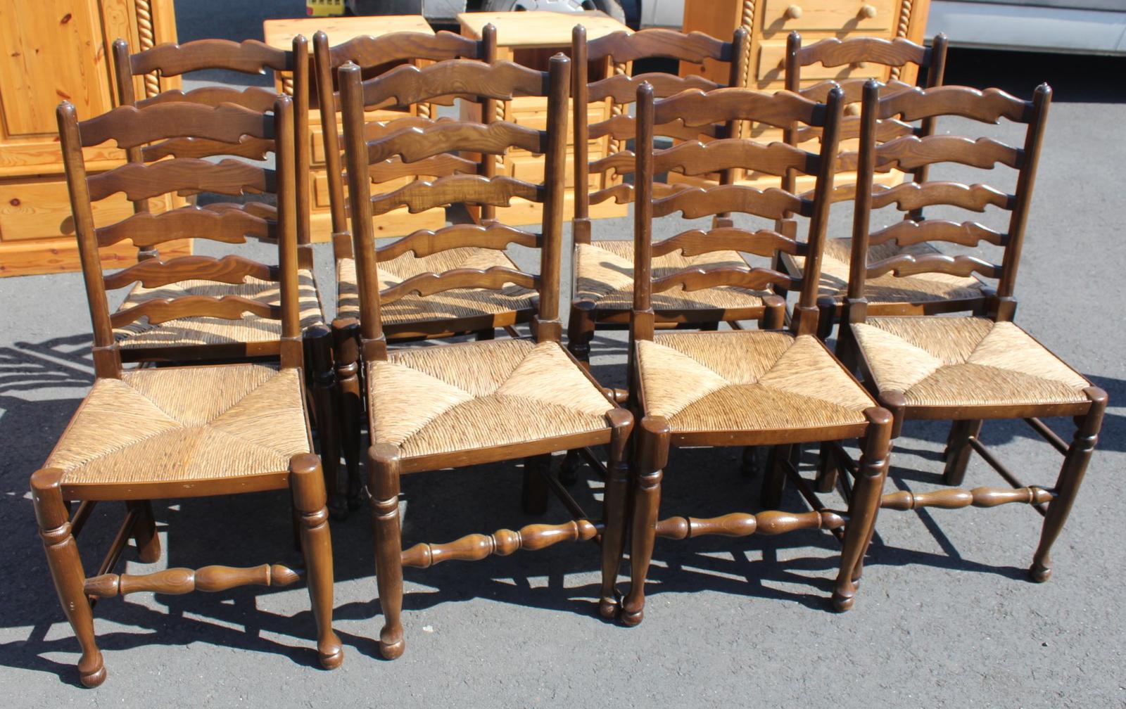 1940's Set of 8 Oak Ladder Back Dining Chairs with Rush Seats