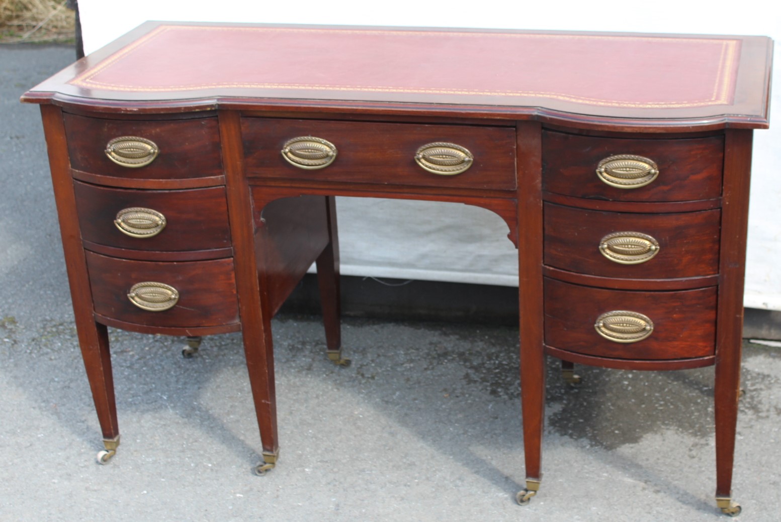 1940s Solid Mahogany Desk Bow Front with Red Leather Inset