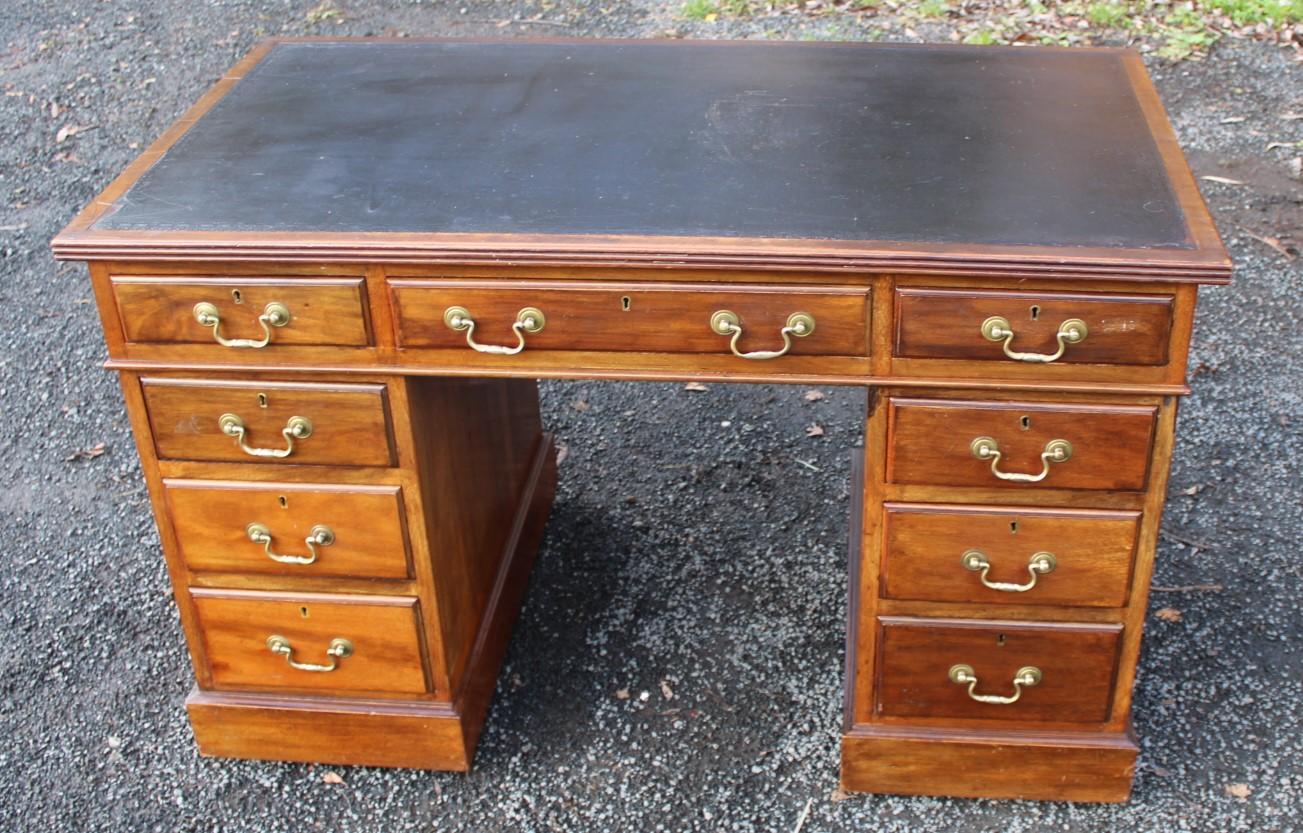 1940s Solid Mahogany Pedestal Desk with Green Leather + Key