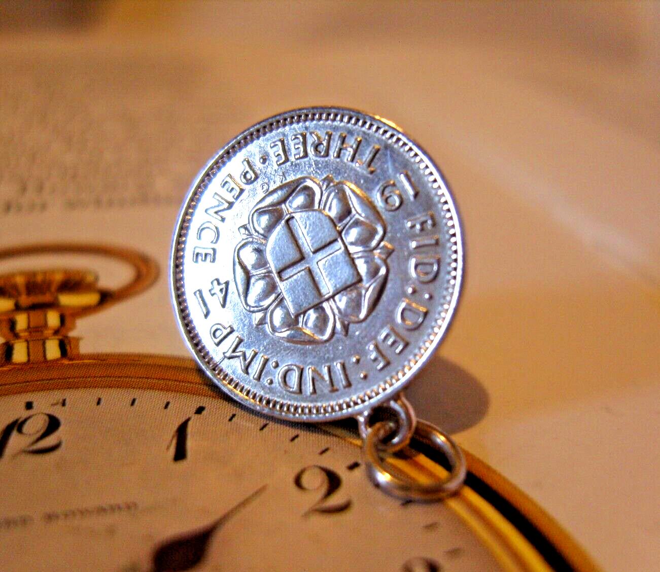 1941 Fob WW2 Vintage Pocket Watch Chain Silver Three Pence Lucky Coin Fob