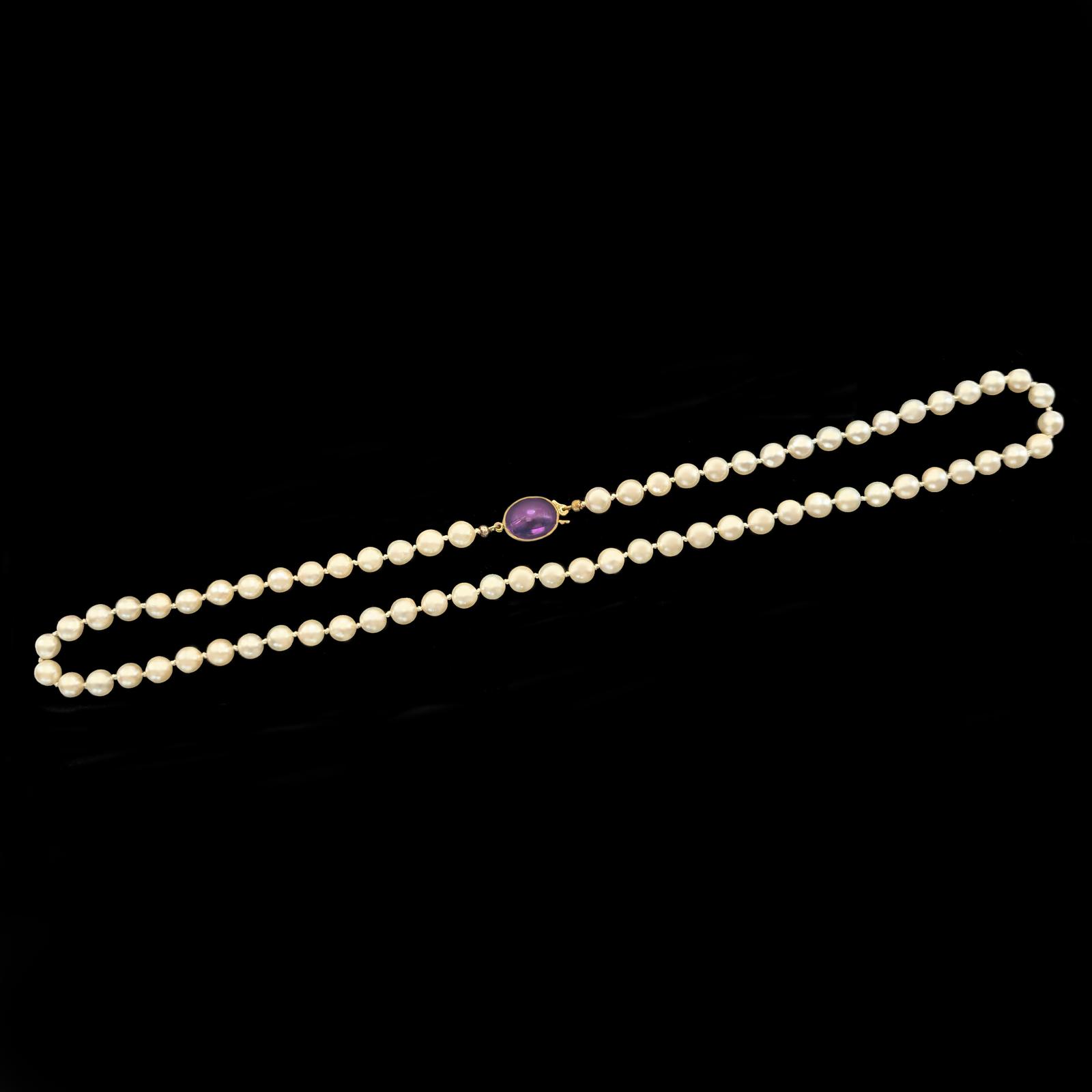 1950s Cultured Pearl Necklace with Amethyst 14ct Gold Clasp
