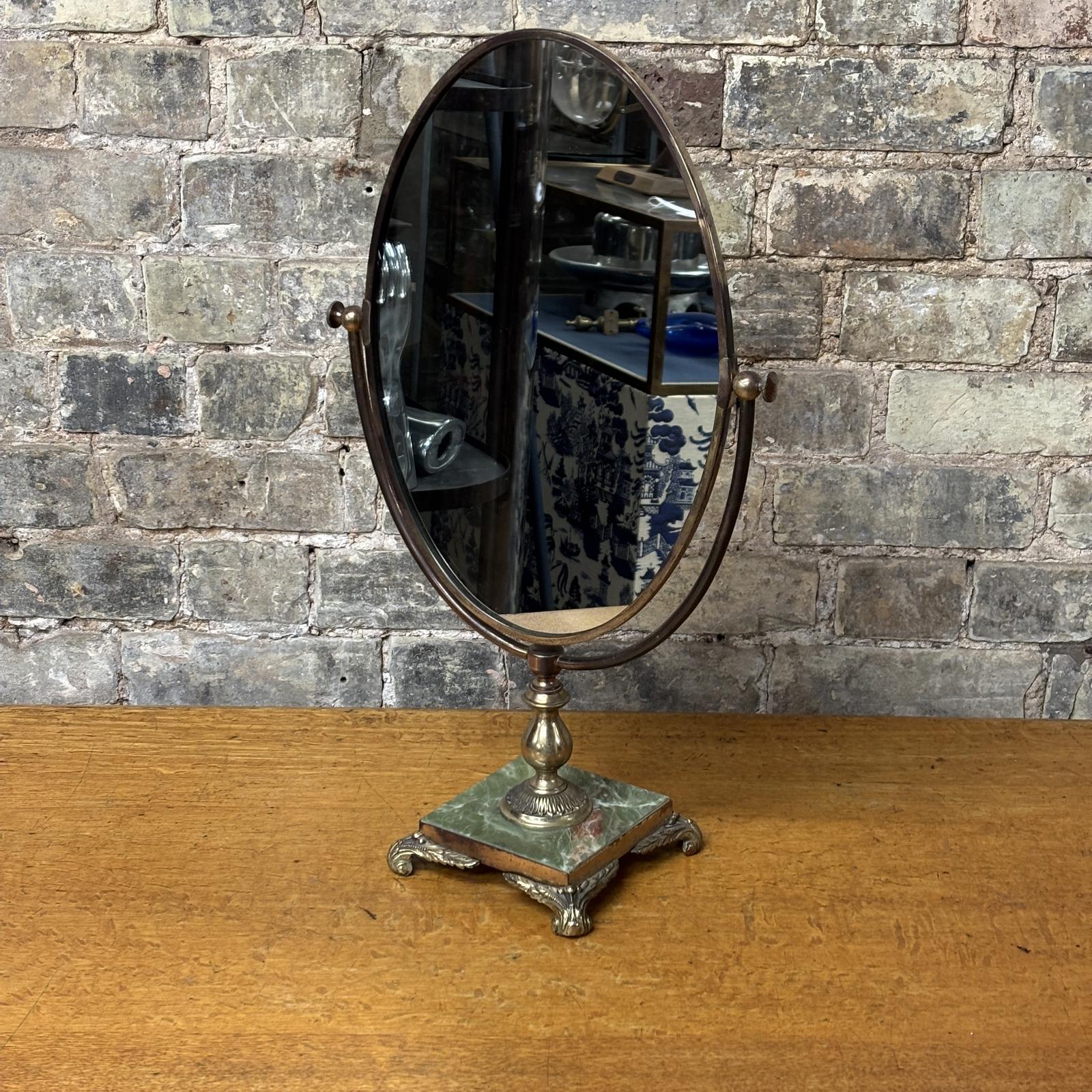 A fabulous 1950s by Peerage England. The mirror sits within a bronze oval frame and is supported on a central column, allowing it to tilt and adjust using the original side knobs. The base is made from green onyx with natural veining, and is mounted with decorative cast metal feet which give the piece a nice bit of decorative flair while also providing a solid weight.