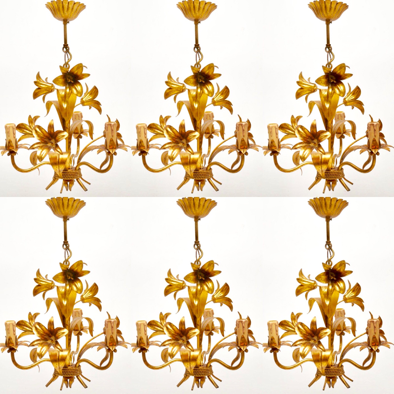 1950s Set of 6 Vintage Italian Gilt Metal Chandeliers