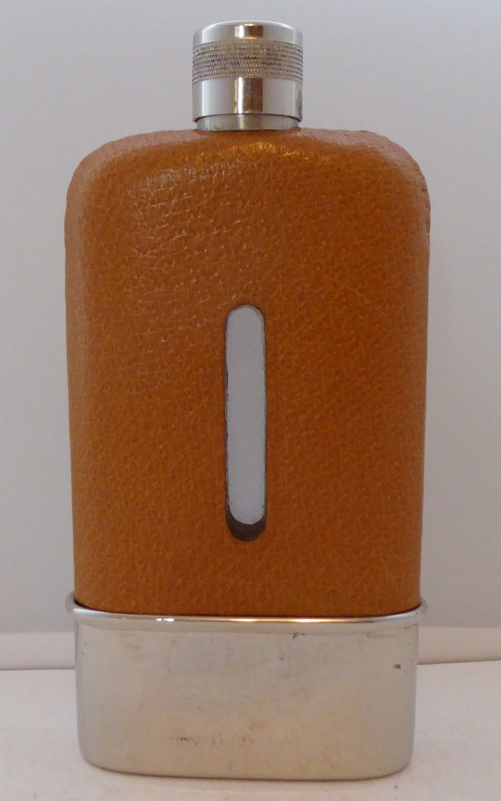 1950s Silver Plated Leather Pig Skin Bound Glass Hip Flask Mint & Boxed