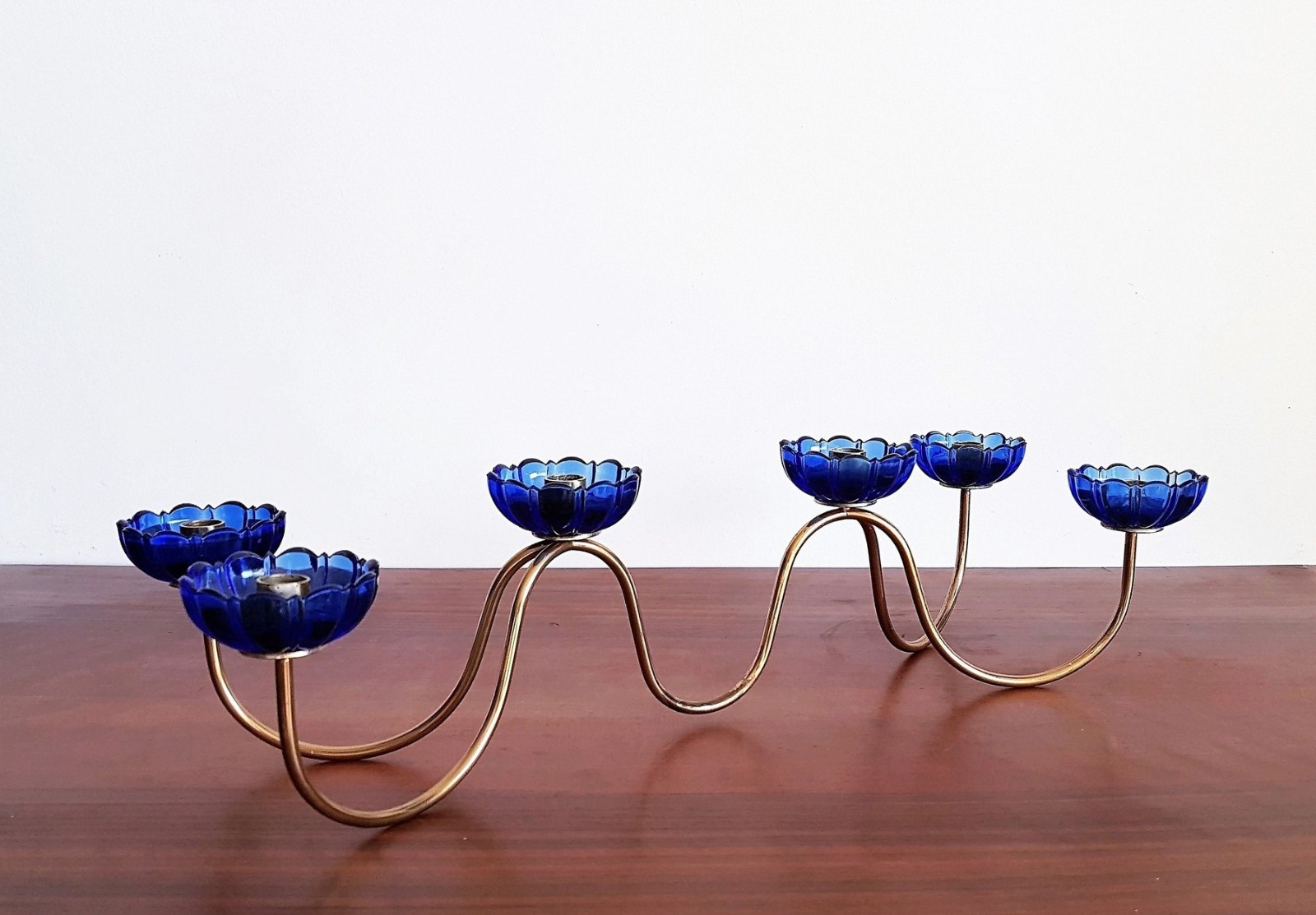 1950s Swedish Ystad Metall Modernist Blue Glass & Brass Candelabra by Gunnar Ander