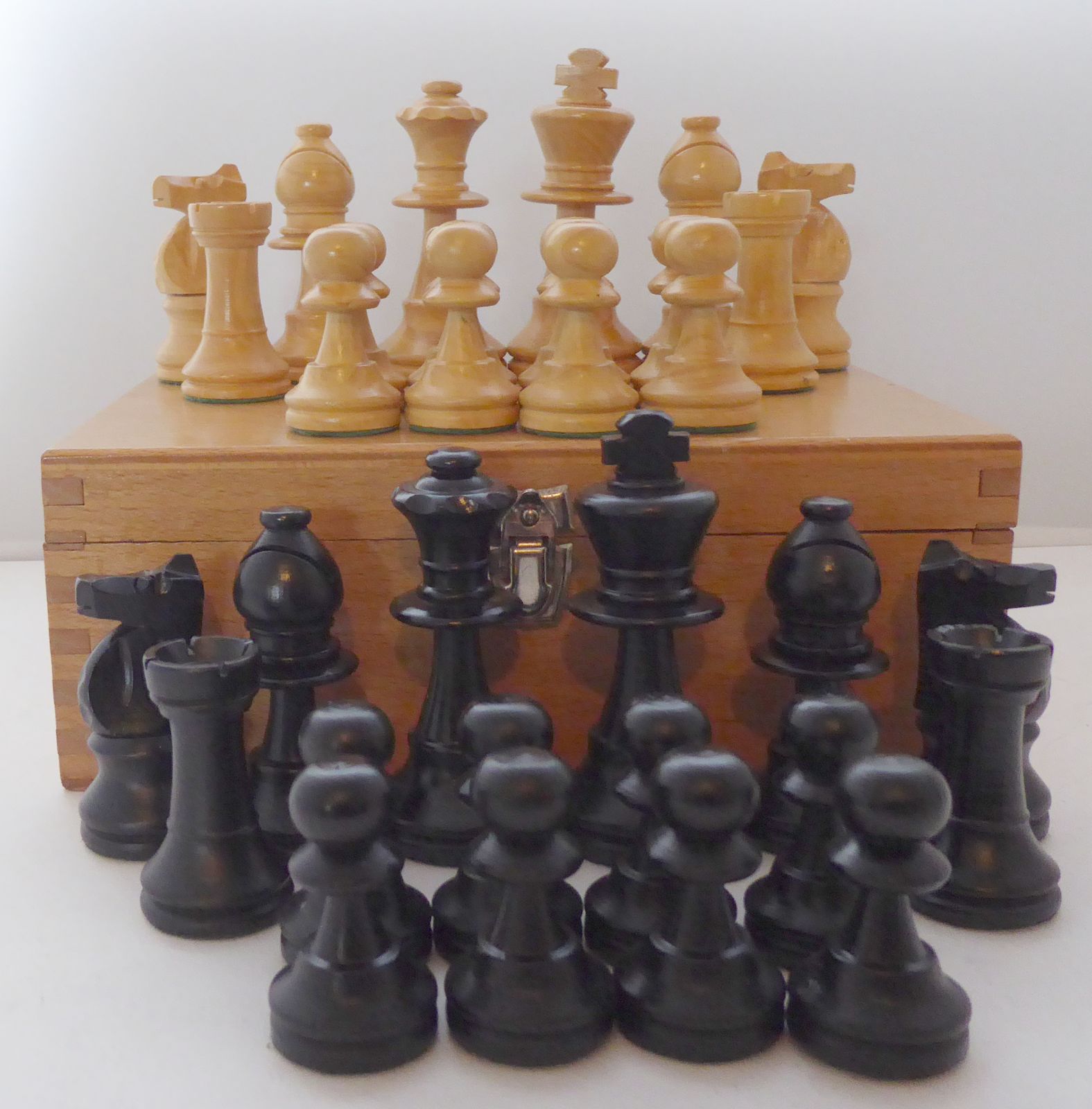 1950s Wooden Chess Set Weighted Original Box Ebonised & Box Wood King 7.4cm