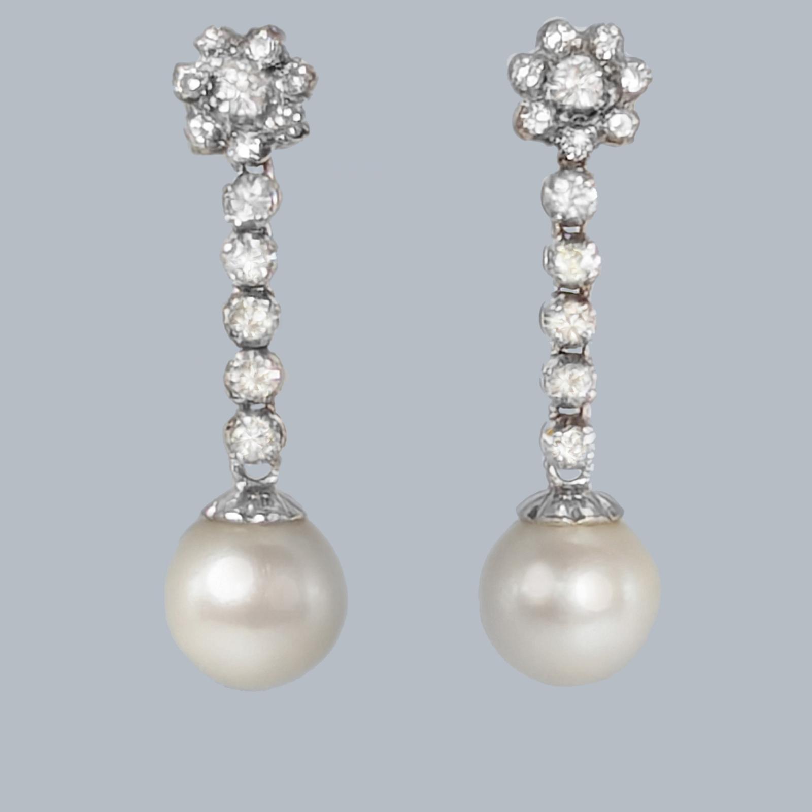 A beautifully refined pair of 1960s diamond and pearl drop earrings, exemplifying the understated elegance of mid-century jewellery design.