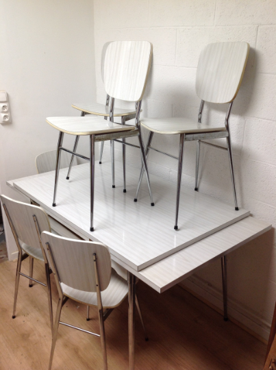 1960s / 1970s French Formica & Chrome 5 Piece Dining Kitchen Table Suite Draw Leaf Pull Out Leaf Table & 4 Chairs Almost Perfect Condition